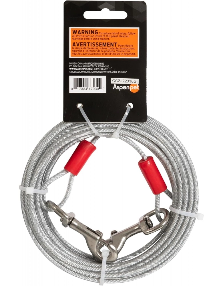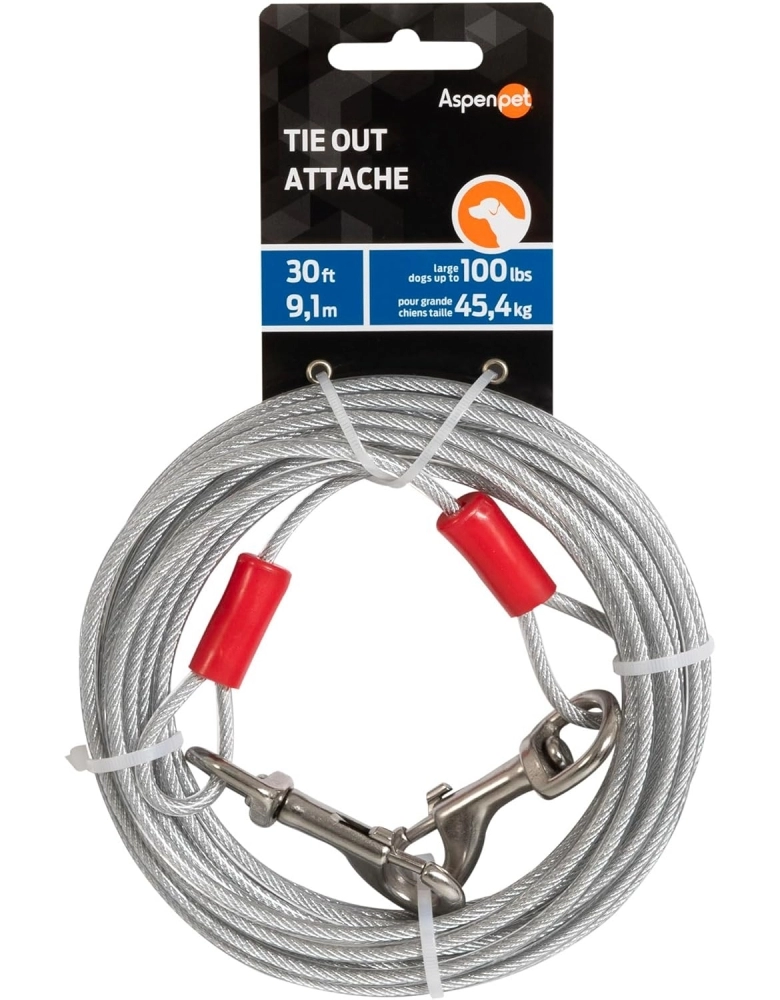 Aspen Pet Tie Out Attache é um cabo de aço encapado para não enroscar nos pelos do cão. Feito para aqueles momentos em que o cão precisa ficar restringido a uma área, mas sem abrir mão de liberdade. São 9,1 metros de liberdade, mas sem permitir que o cão escape. Para cães até 45kg.