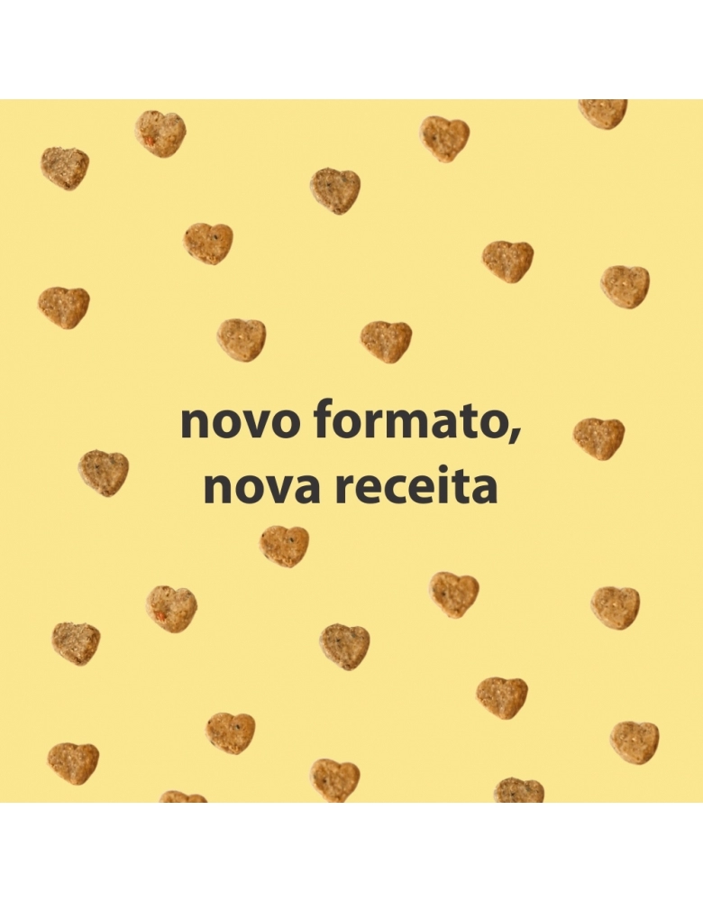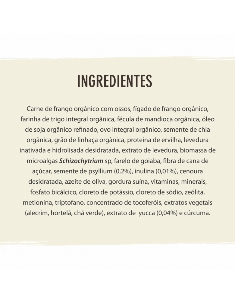Carne de frango orgânico com ossos, fígado de frango orgânico, farinha de trigo integral orgânica, fécula de mandioca orgânica, óleo de soja orgânico refinado, ovo integral orgânico, semente de chia orgânica, grão de linhaça orgânica, proteína de ervilha, levedura inativada e hidrolisada desidratada, extrato de levedura, biomassa de microalgas Schizochytrium sp, farelo de goiaba, fibra de cana de açúcar, semente de psyllium (0,2%), inulina (0,01%), cenoura desidratada, azeite de oliva, gordura suína, vitaminas (A, D, E, K3, C, B1, B2, B3, B5, B12, biotina, ácido fólico, fosfatilcolina), minerais (selenito de sódio, sulfato ferroso, sulfato de cobre, iodato de cálcio, sulfato de zinco, organozinco, sulfato de manganês, organomanganês, organoselênio), fosfato bicálcico, cloreto de potássio, cloreto de sódio, zeólita, metionina, triptofano, concentrado de tocoferóis, extratos vegetais (alecrim, hortelã, chá verde), extrato de yucca (0,04%) e cúrcuma.