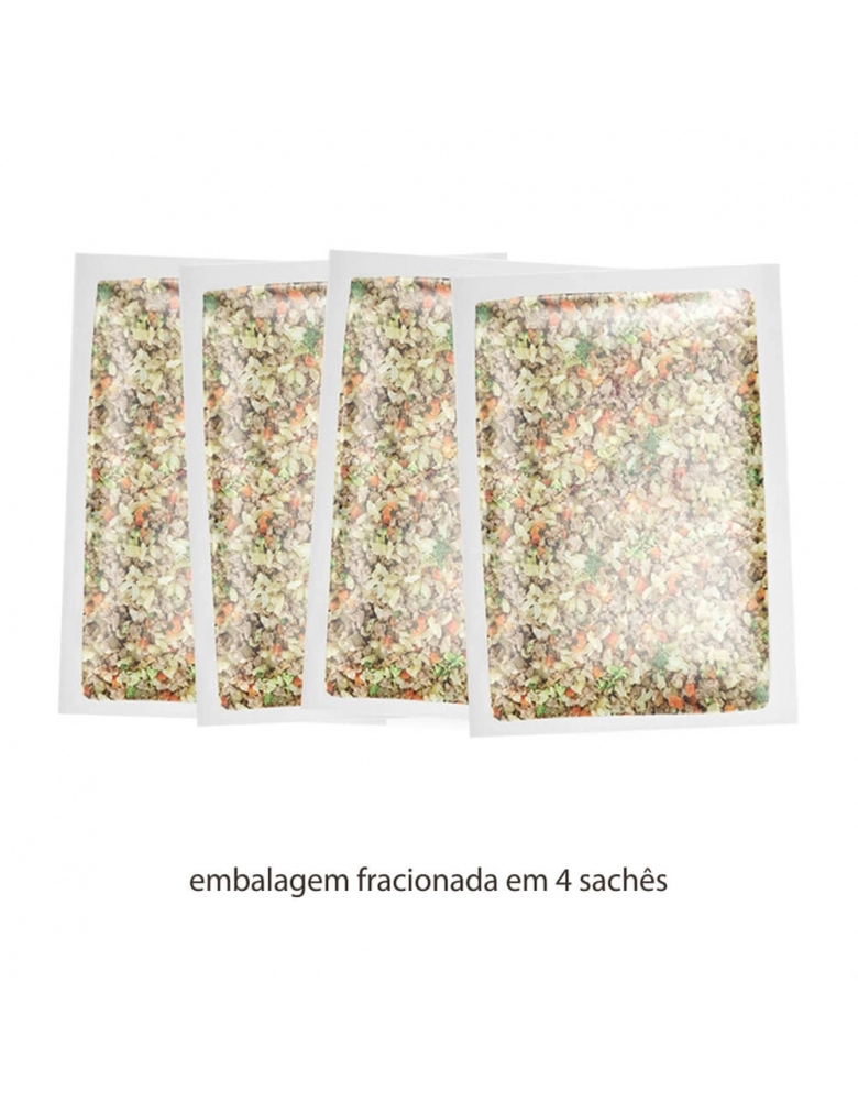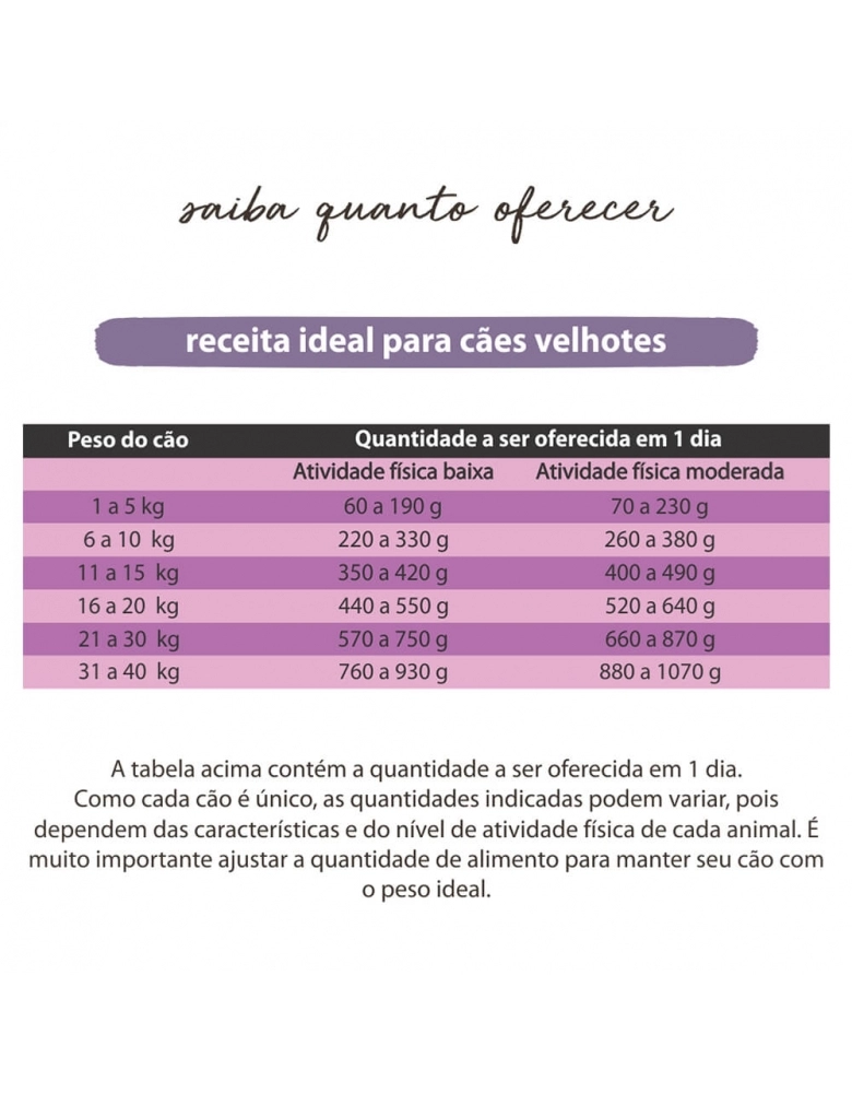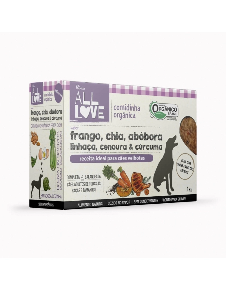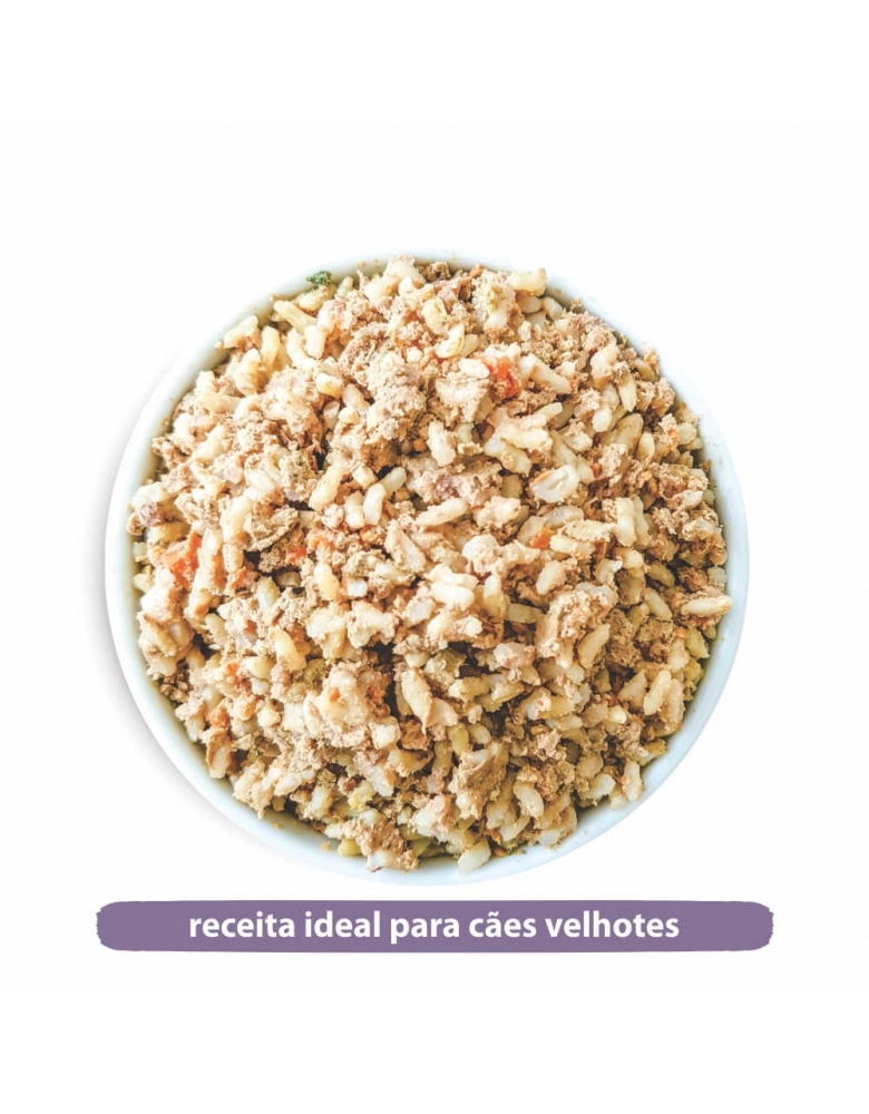 Esta receita para cães velhotes sabor Frango, Chia, Abóbora, Linhaça, Cenoura & Cúrcuma é uma ótima opção para os cães idosos e oferece suporte nutricional preciso para contribuir com saúde e a longevidade do seu velhote. Nossa comidinha orgânica é completa e foi cientificamente balanceada para fornecer todos os nutrientes que o seu velhotinho precisa para viver com saúde. É ideal para cães idosos de todas as raças e tamanhos. Nossa comidinha orgânica não contém corantes ou conservantes. É um alimento natural cozido no vapor como você faria em casa e já está pronta para servir, não precisa congelar e nem aquecer. Oferecer nossos alimentos orgânicos para seu pet é garantia de uma alimentação natural, orgânica, sem agrotóxicos ou transgênicos, ou seja, saudável de verdade.