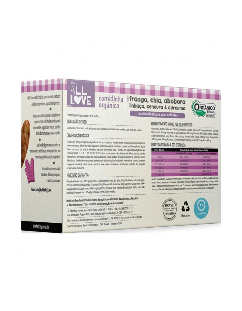 Até o frango, o boi utilizado como ingredientes em alguns produtos da linha All Love, são orgânicos. Consomem alimentos orgânicos, vivem soltos e possuem regras para receberem o selo de orgânico.