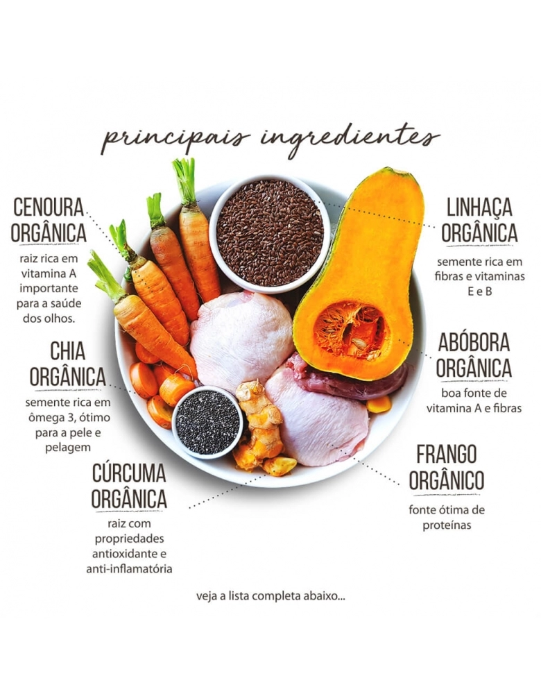 Carne de frango orgânico com ossos, fígado de frango orgânico, arroz integral orgânico, cenoura orgânica, abóbora orgânica, ovo orgânico, óleo de soja orgânico, sementes de chia orgânica, grãos de linhaça orgânica, água*, levedura inativada desidratada*, farelo de goiaba*, colágeno hidrolisado*, biomassa de microalgas Schizochytrium sp, salsinha e orégano desidratados*, vitaminas (A, D3, E, K3, B1, B2, B6, B12, C, niacina, ácido fólico, biotina)*, fosfatilcolina*, minerais (sulfato de ferro, sulfato de cobre, sulfato de manganês, organomanganês, sulfato de zinco, organzinco, iodato de cálcio, selenito de sódio, organoselênio)*, cloreto de potássio*, metionina*, taurina*, tocoferol*, extratos vegetais (alecrim, hortelã, chá verde, yucca, equinácea e alcachofra)*, aloe vera*, extrato de própolis*, cúrcuma*.