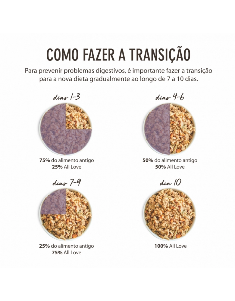 Com os produtos ALL LOVE você tem uma certeza, está oferecendo ao seu melhor amigo, o seu filho de quatro patas, comida de verdade. Equilibrada e com procedência garantida por lei.