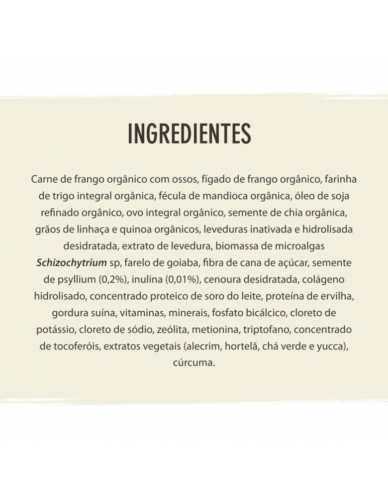 Carne de frango orgânico com ossos, fígado de frango orgânico, farinha de trigo integral orgânica, fécula de mandioca orgânica, óleo de soja refinado orgânico, ovo integral orgânico, semente de chia orgânica, grãos de linhaça e quinoa orgânicos, leveduras inativada e hidrolisada desidratada, extrato de levedura, biomassa de microalgas Schizochytrium sp, farelo de goiaba, fibra de cana de açúcar, semente de psyllium (0,2%), inulina (0,01%) cenoura desidratada, colágeno hidrolisado, concentrado proteico de soro do leite, proteína de ervilha, gordura suína, vitaminas (A, D, E, K3, C, B1, B2, B3, B5, B12, biotina, ácido fólico, fosfatilcolina), minerais (selenito de sódio, sulfato ferroso, sulfato de cobre, iodato de cálcio, sulfato de zinco, organozinco, sulfato de manganês, organomanganês, organoselênio), fosfato bicálcico, cloreto de potássio, cloreto de sódio, zeólita, metionina, triptofano, concentrado de tocoferóis, extratos vegetais (alecrim, hortelã, chá verde e yucca), cúrcuma.
