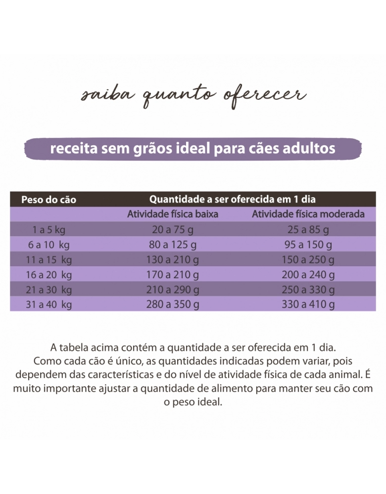 Os cães podem se beneficiar de uma dieta sem grãos em algum momento da vida. Esta receita sabor Frango, Chia, Tapioca & Cúrcuma é completa e foi cientificamente balanceada para suprir todas as necessidades nutricionais do seu cão. Não contém glúten e é indicada para cães adultos de todas as raças e tamanhos que precisam limitar a ingestão desse ingrediente. O extrato de Yucca e as fibras prebióticas favorecem o equilíbrio do sistema digestivo. Contém ômegas 3 e 6 importantes para a pele e a pelagem.