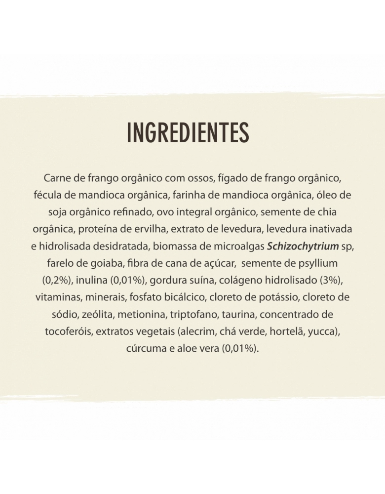 Carne de frango orgânico com ossos, fígado de frango orgânico, fécula de mandioca orgânica, farinha de mandioca orgânica, óleo de soja orgânico refinado, ovo integral orgânico, semente de chia orgânica, proteína de ervilha, extrato de levedura, levedura inativada e hidrolisada desidratada, biomassa de microalgas Schizochytrium sp, farelo de goiaba, fibra de cana de açúcar, semente de psyllium (0,2%), inulina (0,01%), gordura suína, colágeno hidrolisado (3%), vitaminas (A, D, E, K3, C, B1, B2, B3, B5, B12, biotina, ácido fólico, fosfatilcolina), minerais (selenito de sódio, sulfato ferroso, sulfato de cobre, iodato de cálcio, sulfato de zinco, organozinco, sulfato de manganês, organomanganês, organoselênio), fosfato bicálcico, cloreto de potássio, cloreto de sódio, zeólita, metionina, triptofano, taurina, concentrado de tocoferóis, extratos vegetais (alecrim, chá verde, hortelã, yucca), cúrcuma e aloe vera (0,01%).