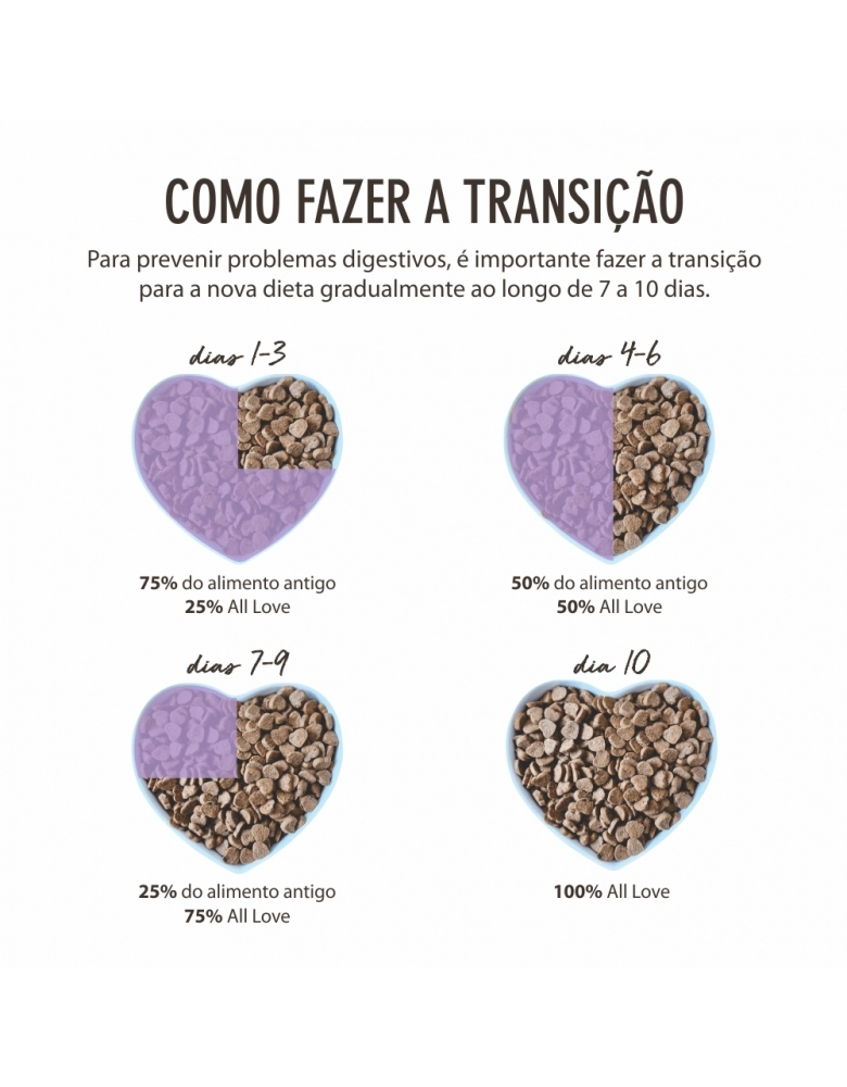 Com os produtos ALL LOVE você tem uma certeza, está oferecendo ao seu melhor amigo, o seu filho de quatro patas, comida de verdade. Equilibrada e com procedência garantida por lei.