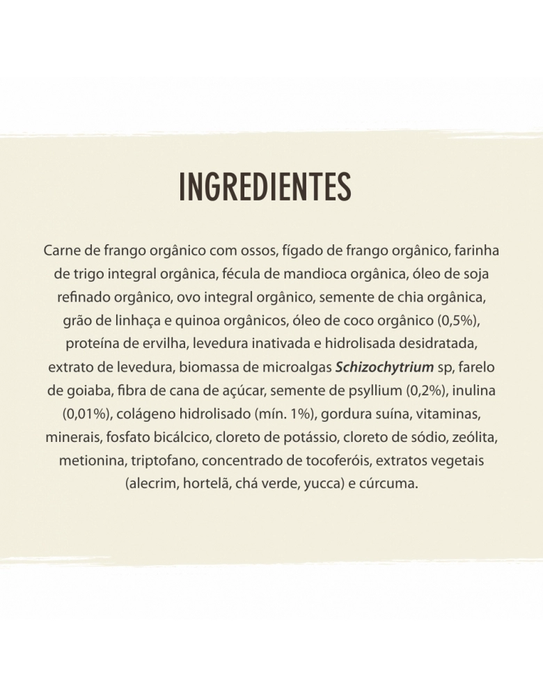 Carne de frango orgânico com ossos, fígado de frango orgânico, farinha de trigo integral orgânica, fécula de mandioca orgânica, óleo de soja refinado orgânico, ovo integral orgânico, semente de chia orgânica, grão de linhaça e quinoa orgânicos, óleo de coco orgânico (0,5%), proteína de ervilha, levedura inativada e hidrolisada desidratada, extrato de levedura, biomassa de microalgas Schizochytrium sp, farelo de goiaba, fibra de cana de açúcar, semente de psyllium (0,2%), inulina (0,01%), colágeno hidrolisado (mín. 1%), gordura suína, vitaminas (A, D, E, K3, C, B1, B2, B3, B5, B12, biotina, ácido fólico, fosfatilcolina), minerais (selenito de sódio, sulfato ferroso, sulfato de cobre, iodato de cálcio, sulfato de zinco, organozinco, sulfato de manganês, organomanganês, organoselênio), fosfato bicálcico, cloreto de potássio, cloreto de sódio, zeólita, metionina, triptofano, concentrado de tocoferóis, extratos vegetais (alecrim, hortelã, chá verde, yucca) e cúrcuma.