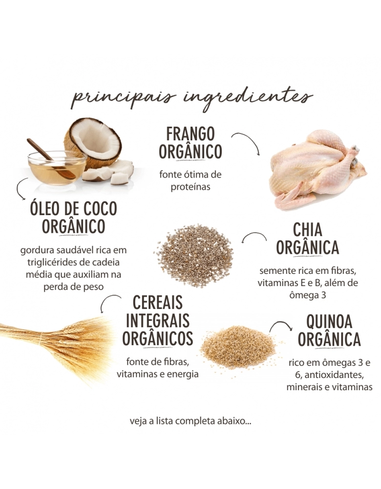 Carne de frango orgânico com ossos, fígado de frango orgânico, farinha de trigo integral orgânica, fécula de mandioca orgânica, óleo de soja refinado orgânico, ovo integral orgânico, semente de chia orgânica, grão de linhaça e quinoa orgânicos, óleo de coco orgânico (0,5%), proteína de ervilha, levedura inativada e hidrolisada desidratada, extrato de levedura, biomassa de microalgas Schizochytrium sp, farelo de goiaba, fibra de cana de açúcar, semente de psyllium (0,2%), inulina (0,01%), colágeno hidrolisado (mín. 1%), gordura suína, vitaminas (A, D, E, K3, C, B1, B2, B3, B5, B12, biotina, ácido fólico, fosfatilcolina), minerais (selenito de sódio, sulfato ferroso, sulfato de cobre, iodato de cálcio, sulfato de zinco, organozinco, sulfato de manganês, organomanganês, organoselênio), fosfato bicálcico, cloreto de potássio, cloreto de sódio, zeólita, metionina, triptofano, concentrado de tocoferóis, extratos vegetais (alecrim, hortelã, chá verde, yucca) e cúrcuma.
