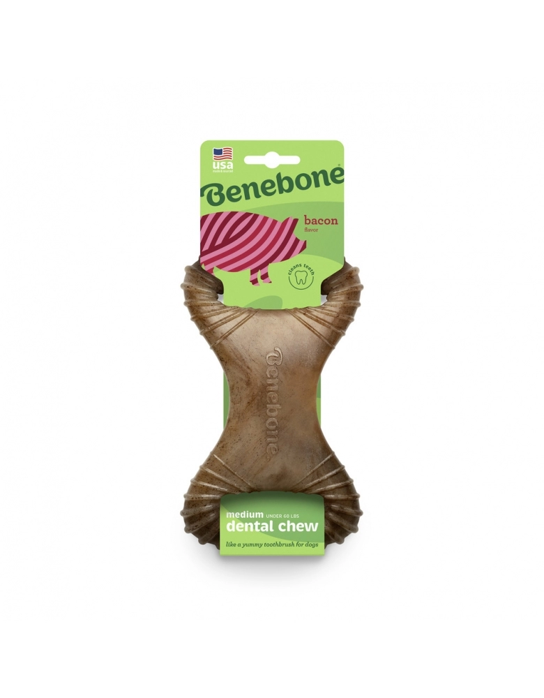 Benebone Dental Chew está disponível em 3 tamanhos e 3 sabores. Bacon, Amendoim ou Frango. Todos com apenas dois ingredientes.