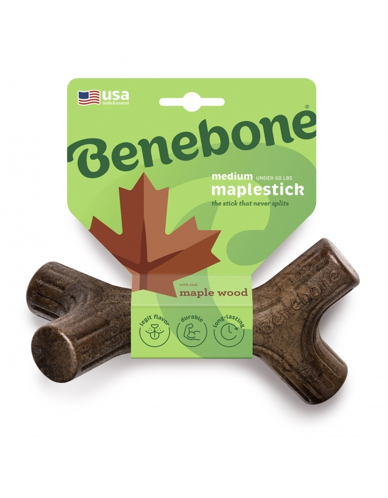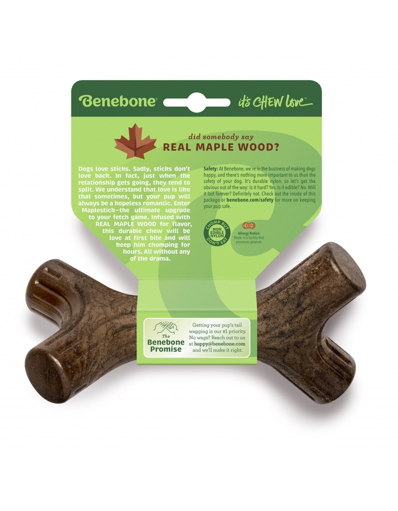 O Benebone Maplestick é um brinquedo feito com apenas 2 ingredientes: Nylon e Madeira de Maple de verdade. Possui um formato muito parecido com um graveto de madeira, fazendo com que seu cão consiga mordê-lo em qualquer posição que esteja.