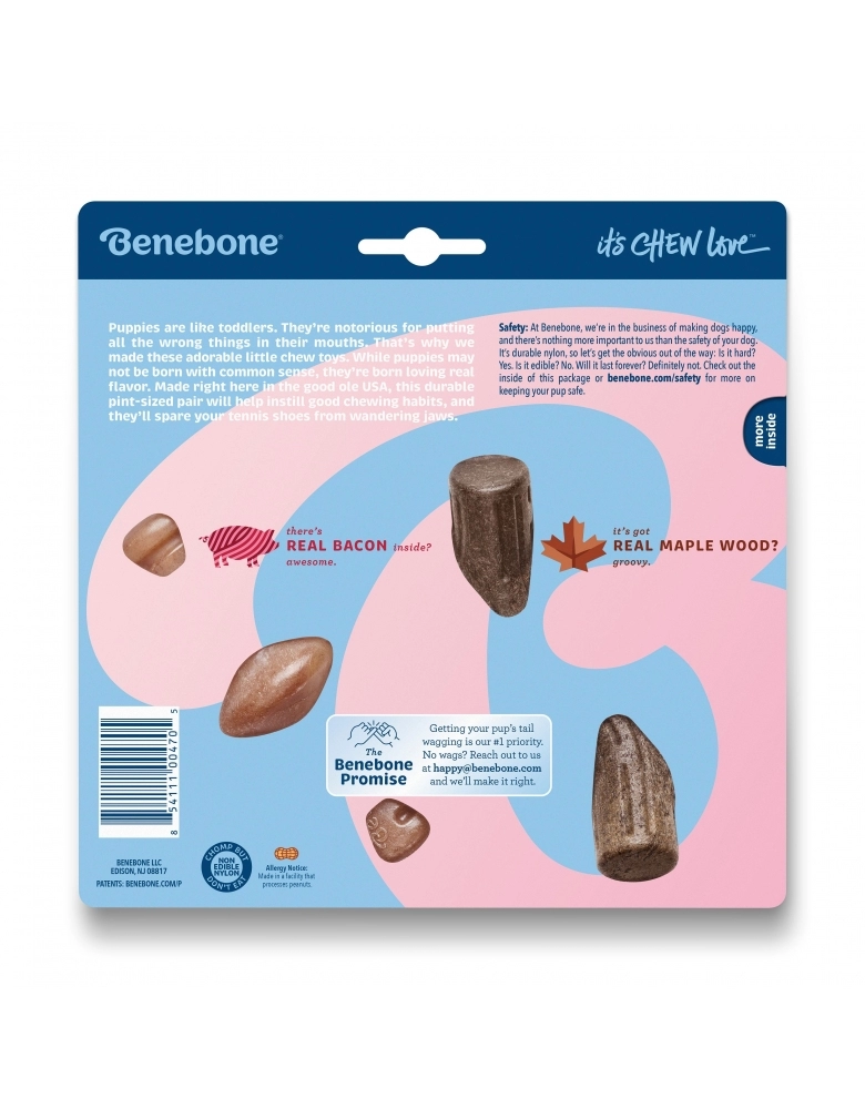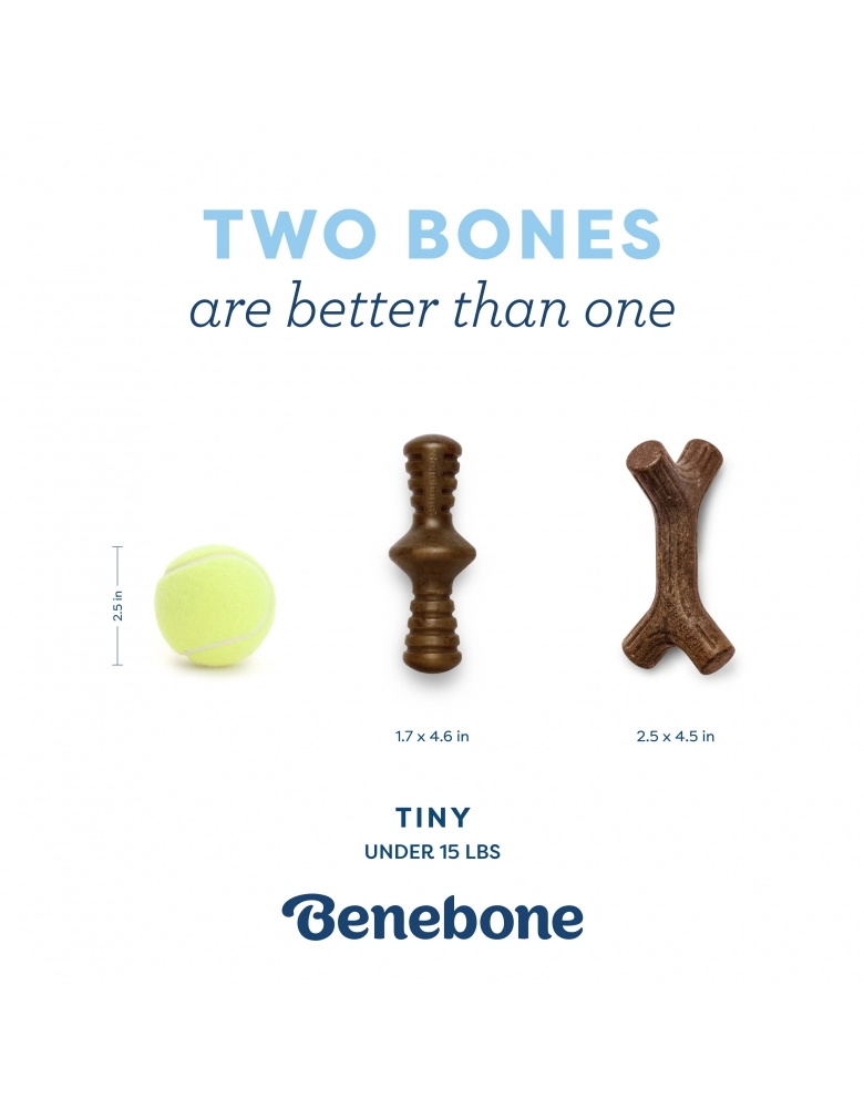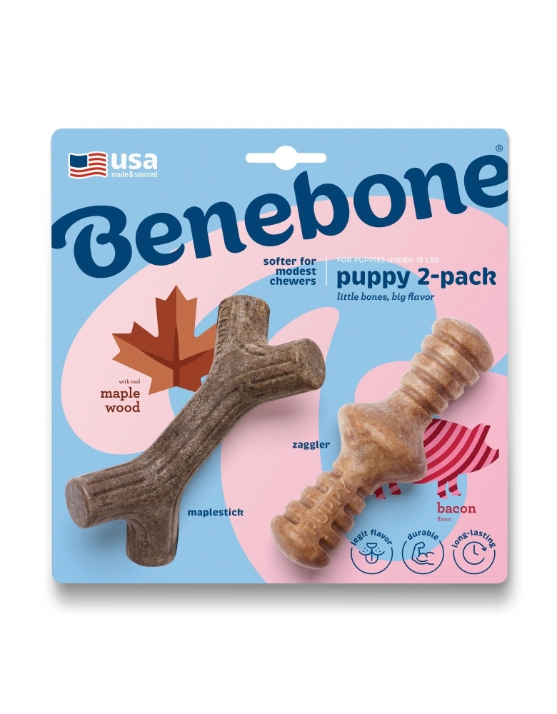 BENEBONE é um brinquedo para roer, destinados a cães, feito com um sabor verdadeiro. Não há adição de palatabilizantes ou odores artificiais. BENEBONE é feito com nylon atóxico e madeira de maple (Maplestick) e feito com nylon atóxico e bacon de verdade (Zaggler). Pequeno: Cães até 13kg, Médio: Cães até 27kg, Grande: Cães até 40kg