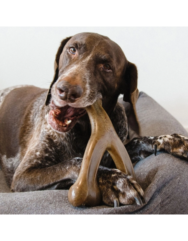 O Benebone Wishbone é um brinquedo que possui um formato de "ossinho da sorte". Possui cantos arredondados, totalmente ergonômico e confortável para os cães. Em qualquer posição que o cão pegar, ele conseguirá roer confortavelmente.