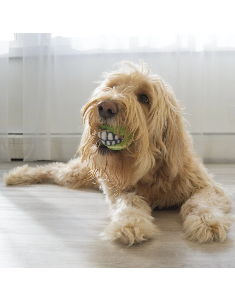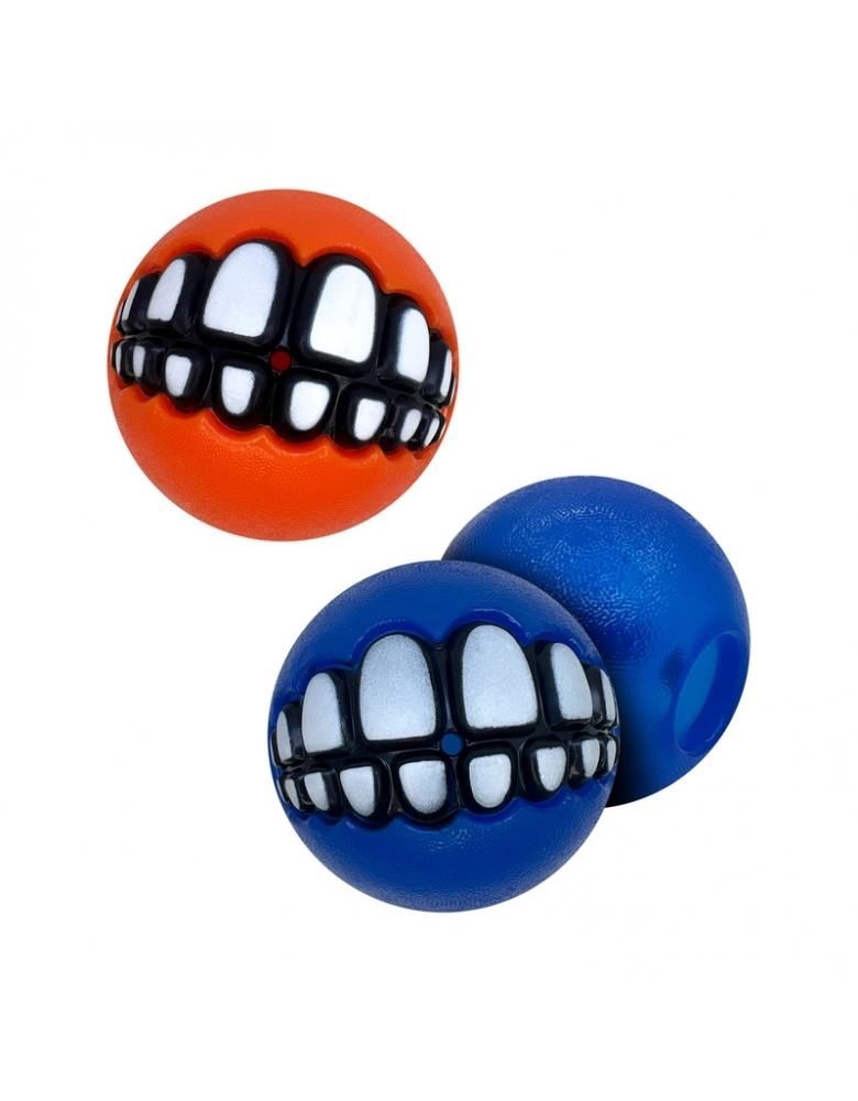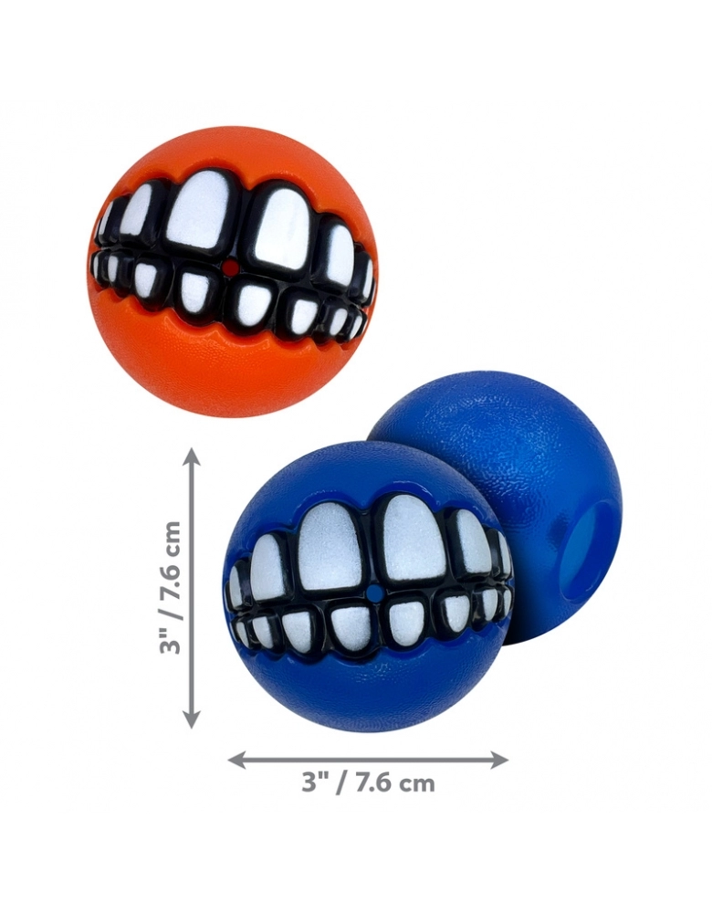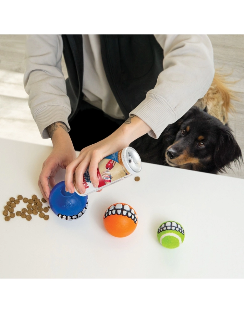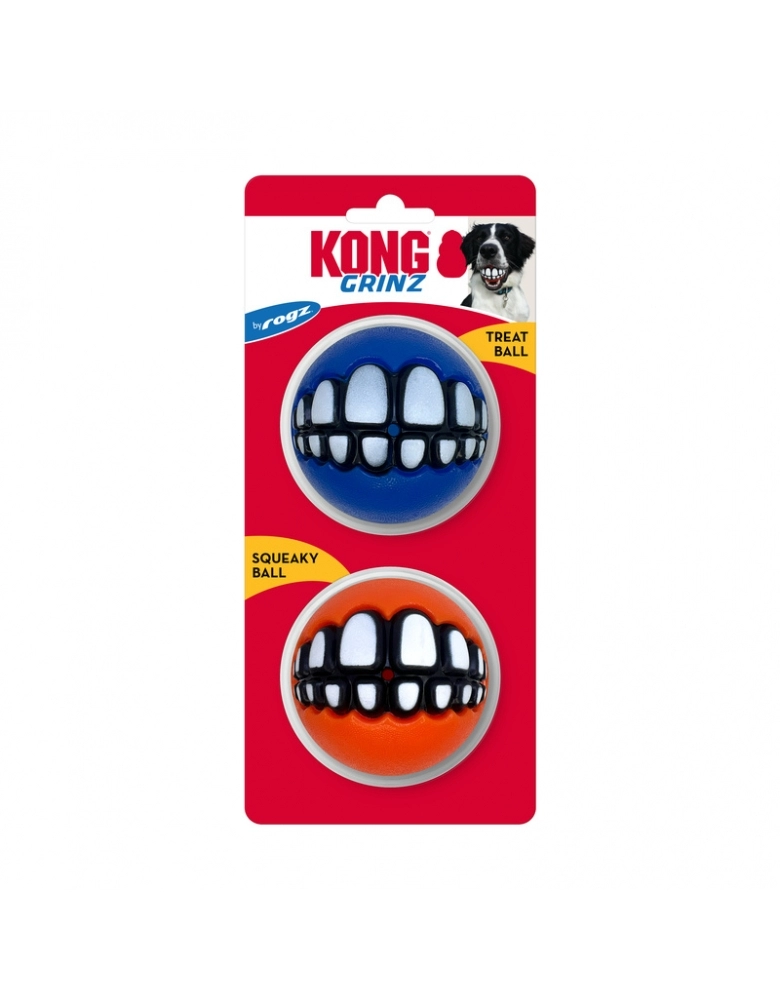 KONG Grinz by ROGZ ´Variety é um kit com 3 bolinhas diferentes (ou duas no caso do tamanho grande) que vem uma bolinha para colocar petiscos, uma de tênis e outra com apito. A bolinha com furo para petiscos, provém enriquecimento mental e físico. Os demais modelos, pura diversão. Todas elas possuem um sorriso que, dependendo de como o cão a segura, produz um efeito hilário. Importante: Não é um objeto de roer. Não deve ser deixado sozinho com o cão nem por alguns minutos, até ter certeza de que o cão não irá destruí-lo. Para cães com mordida forte e destruidores, prefira os brinquedos de borracha natural. Acabada a brincadeira, guarde para a próxima. A garantia não cobre danos feitos pelo cão, apenas defeitos de fabricação. Siga as dicas de uso e indicação de tipo de cão.