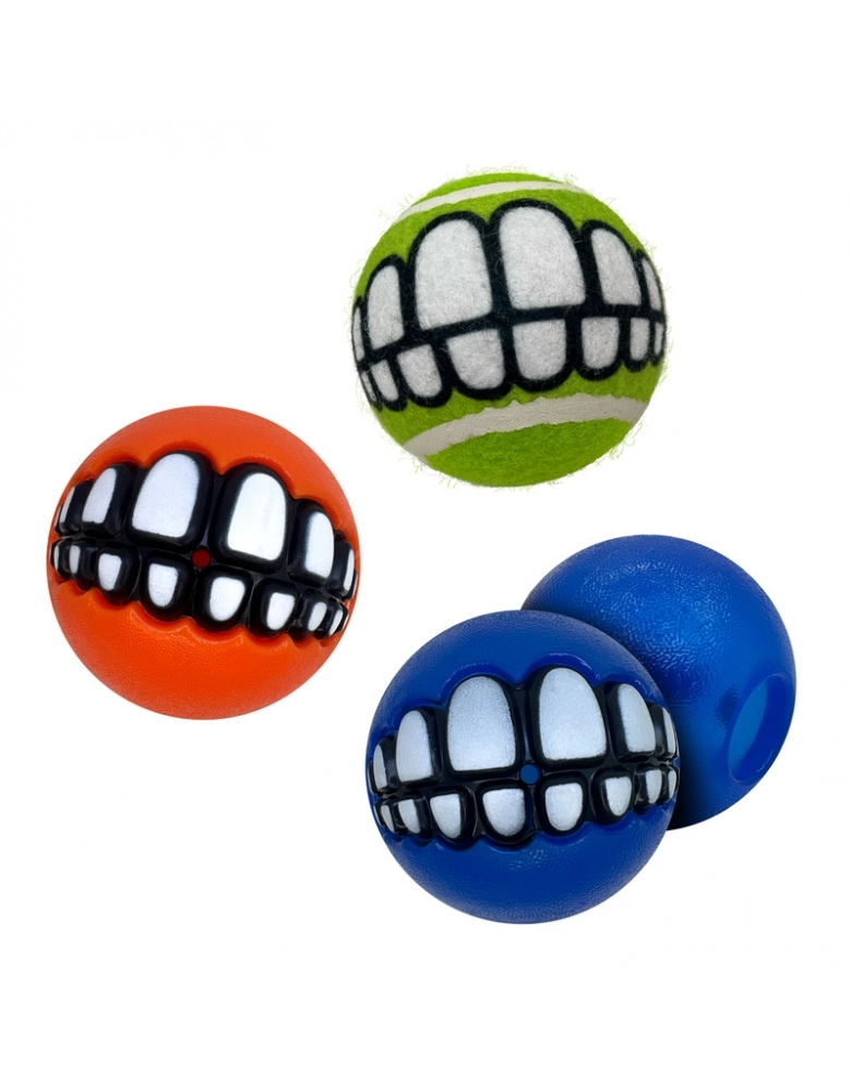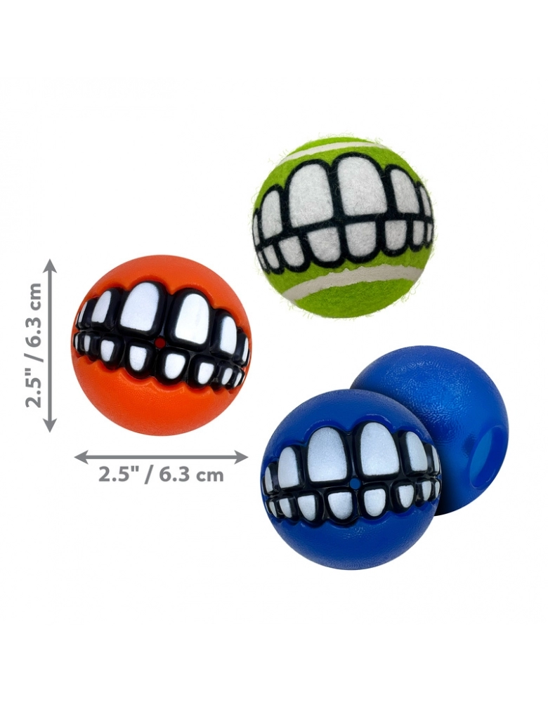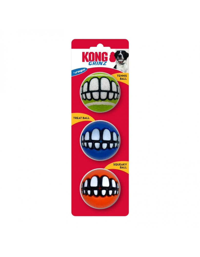 KONG Grinz by ROGZ ´Variety é um kit com 3 bolinhas diferentes (ou duas no caso do tamanho grande) que vem uma bolinha para colocar petiscos, uma de tênis e outra com apito. A bolinha com furo para petiscos, provém enriquecimento mental e físico. Os demais modelos, pura diversão. Todas elas possuem um sorriso que, dependendo de como o cão a segura, produz um efeito hilário. Importante: Não é um objeto de roer. Não deve ser deixado sozinho com o cão nem por alguns minutos, até ter certeza de que o cão não irá destruí-lo. Para cães com mordida forte e destruidores, prefira os brinquedos de borracha natural. Acabada a brincadeira, guarde para a próxima. A garantia não cobre danos feitos pelo cão, apenas defeitos de fabricação. Siga as dicas de uso e indicação de tipo de cão.