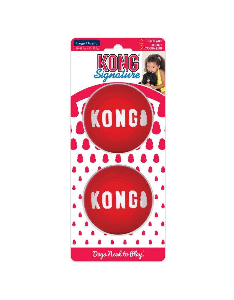 KONG Signature Ball é uma bolinha mais dura que a maioria das bolinhas da KONG e apita. Trata-se de uma bolinha linda que leva a assinatura da KONG. Resistente, porém não indestrutível, é perfeita para cães de mordida moderada. Quica e rola muito bem e pode ser usada dentro e fora de casa, no seco ou no molhado. Flutua se jogada na água.