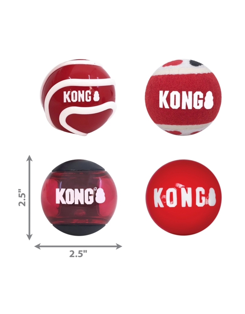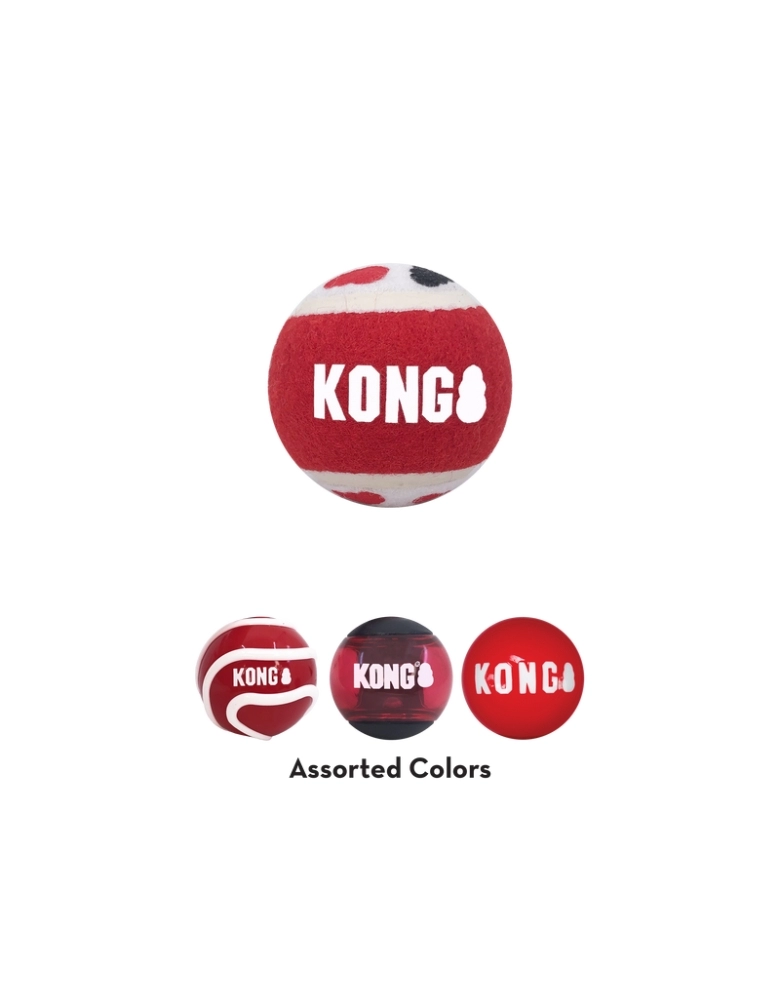 KONG Signature Balls são bolinhas ultra bonitas e com a cara da KONG desenvolvidas para cães de mordidas leves e moderadas e não destruidores. É um brinquedo extremamente durável, se usado adequadamente e destinada à cães não destruidores, para serem jogadas para brincadeiras intermináveis. São 4 bolas diferentes, algumas com e outras sem apito, para serem jogadas e satisfazer os instintos de caçar e trazer.