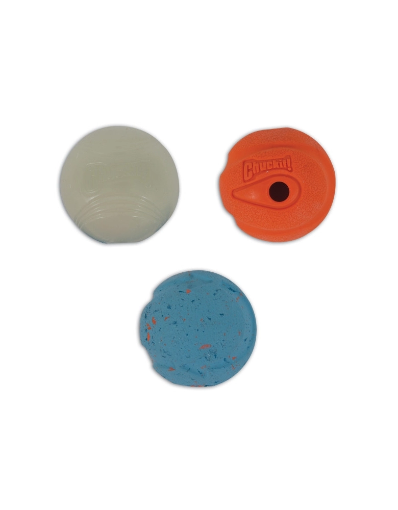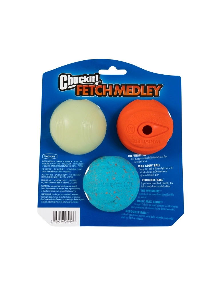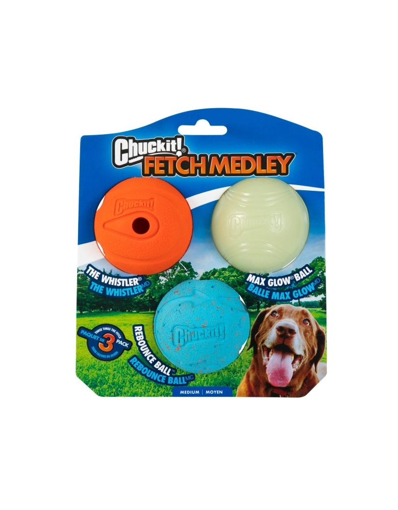 Chuckit! Fetchmedley 3 é um kit com 3 bolinhas médias, para que seu cão escolha qual é sua preferida. Chuckit! Fetch Ball feita com material durável, borracha ultra resistente. Chuckit! Ultra Ball que quicka além da média, alta flutuabilidade na água e alta durabilidade. E a Chuckit! Rugged Ball desenvolvida para brincadeiras fortes. Sesse kit é destinado à cães de mordida mais forte. As bolinhas desse kit são ultra duráveis se usadas da maneira correta.
