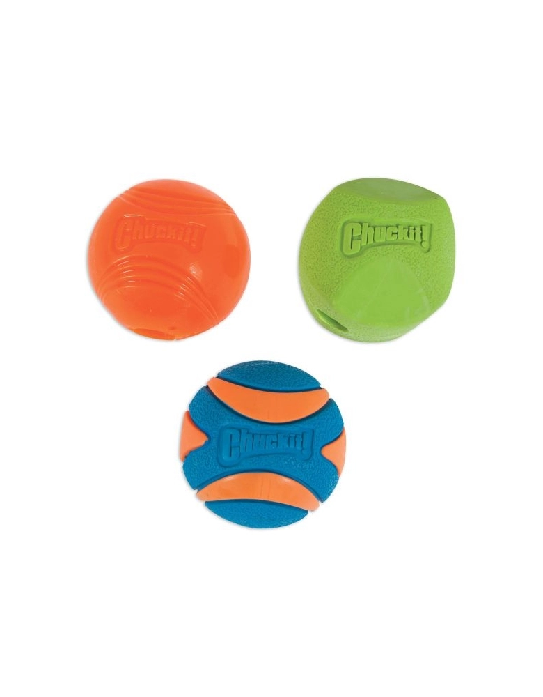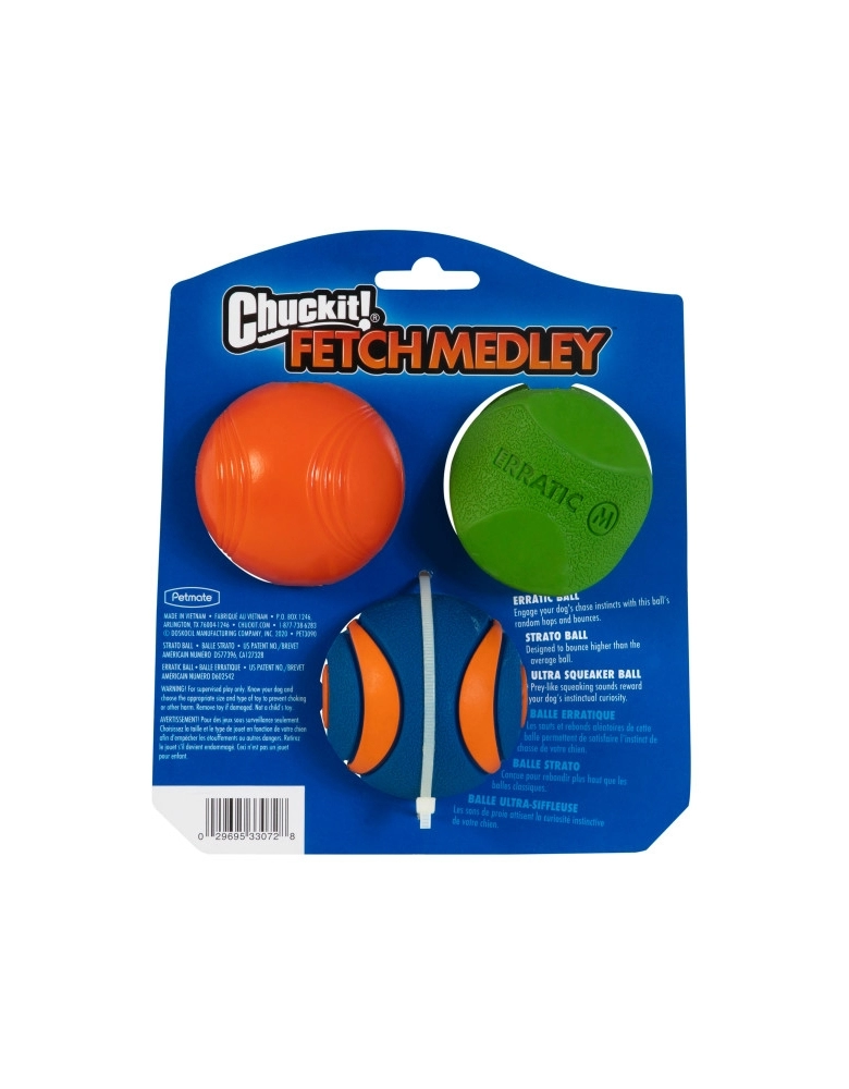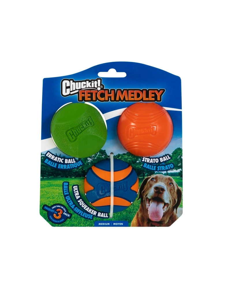 Chuckit! Fetchmedley 2 é um kit com 3 bolinhas médias, para que seu cão escolha qual é sua preferida. Chuckit! Erratic Ball possui um quique totalmente imprevisível, o que estimula ainda mais o seu cão na hora de persegui-la. Chuckit! Strato Ball é desenvolvida para quicar mais alto que a média das bolinhas. E a Chuckit! Ultra Squeaker Ball que possui apito e estimula a curiosidade do seu cão. São feitas de borracha e, portanto, são ultra duráveis se usadas da maneira correta.