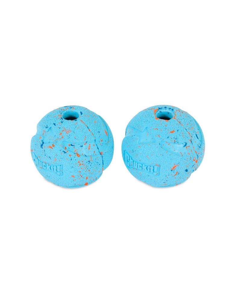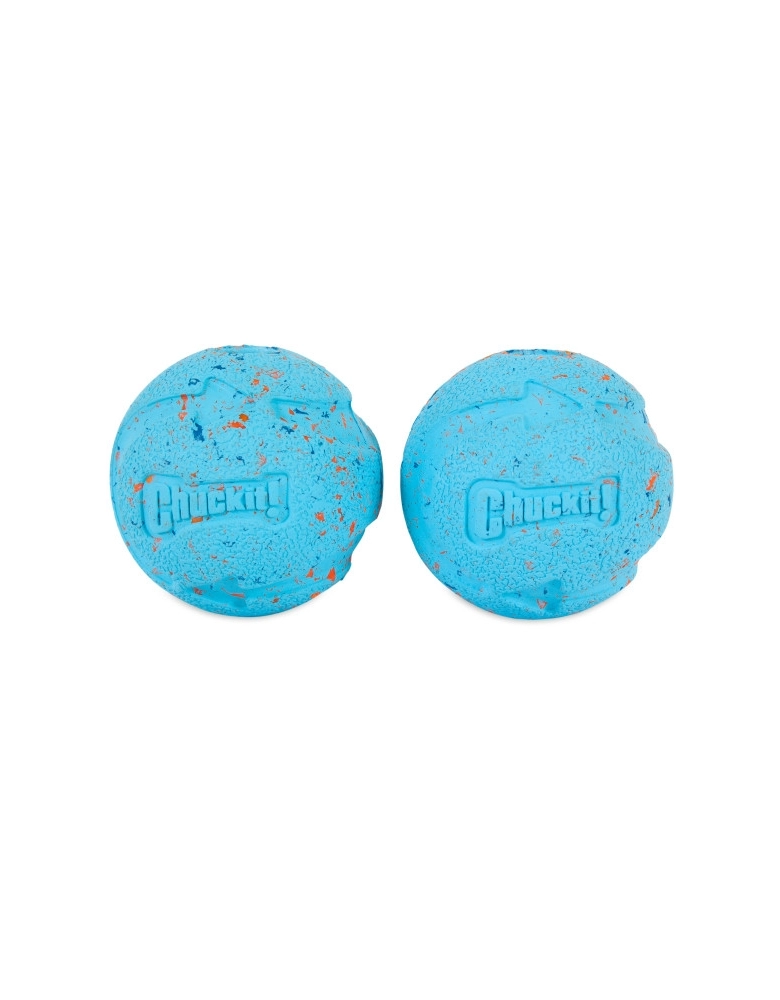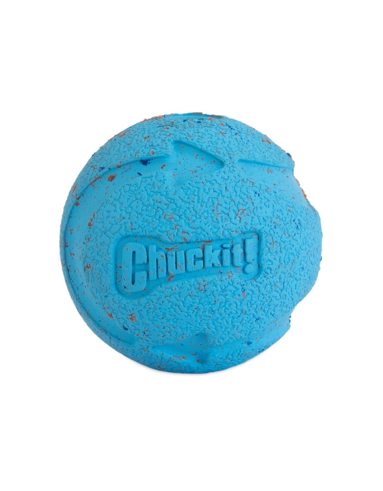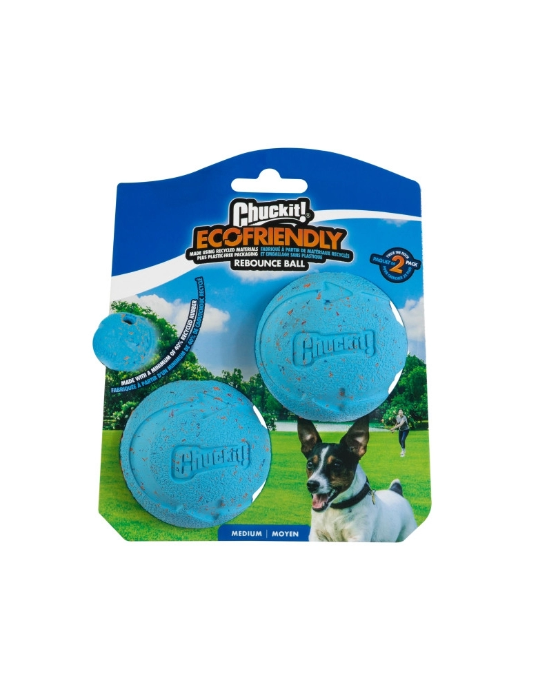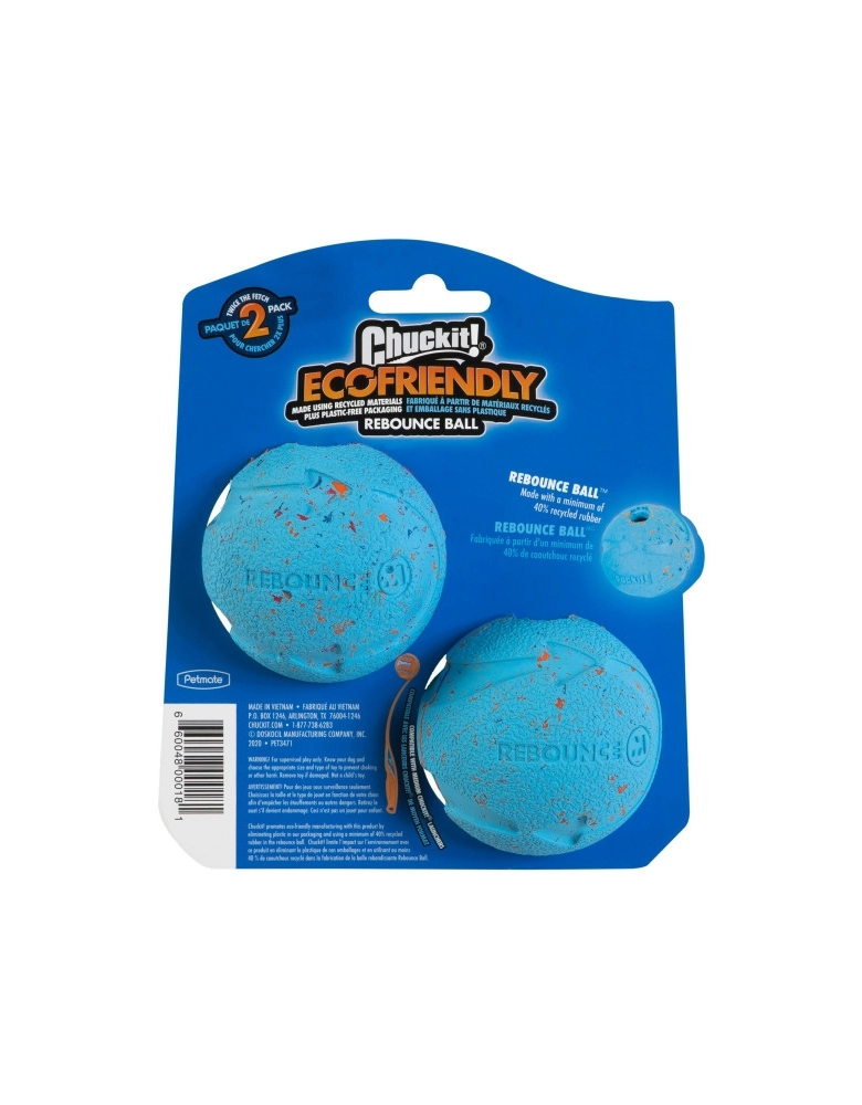 Chuckit! Ecofriendly Rebounce Ball são feitas com um mínimo de 40% de material reciclado e sua embalagem não possui plástico. Possui um quique bem alto. Feita de borracha, é muito resistente e durável se usada da maneira adequada. É compatível com os arremessadores da Chuckit!