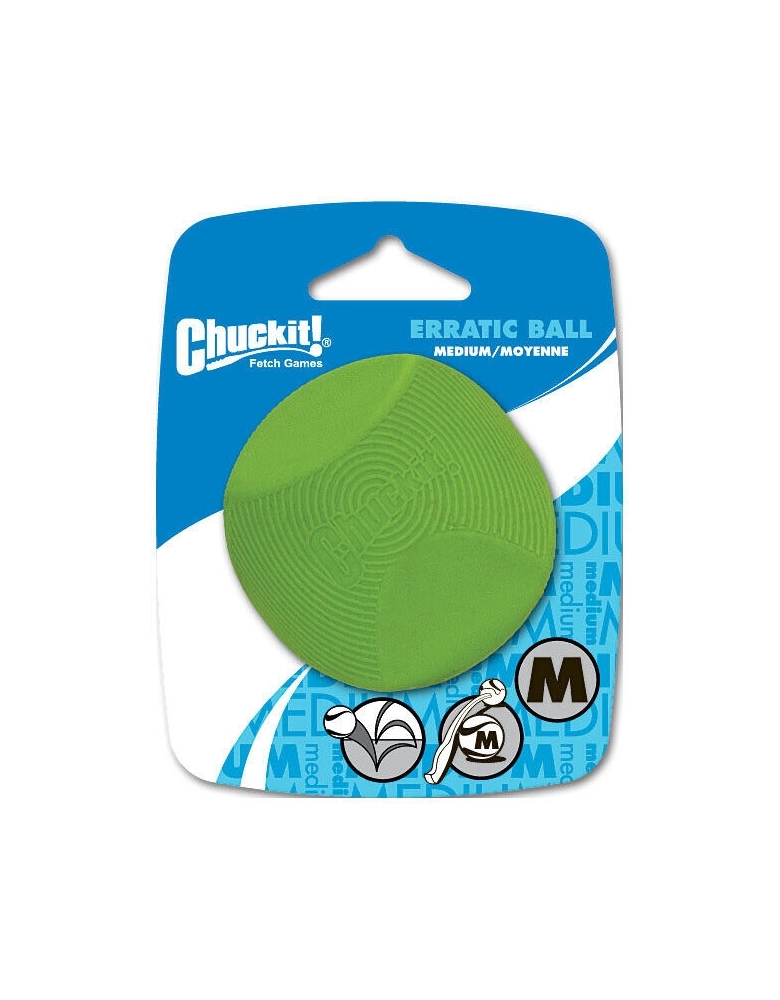 Chuckit! Erratic Ball são feitas de borracha e apresentam um quique errático imprevisível, o que estimula ainda mais o cão e aguça seus instintos primitivos de caça. Muito resistente e durável se usada da maneira adequada. É compatível com os arremessadores da Chuckit!