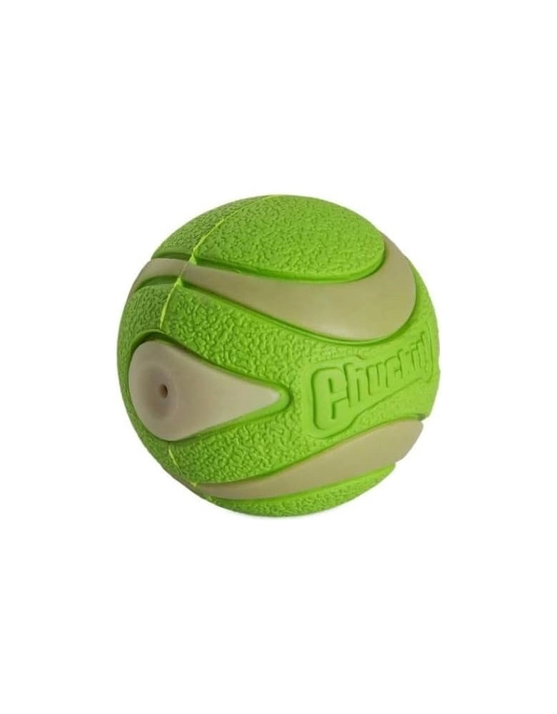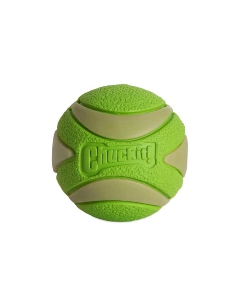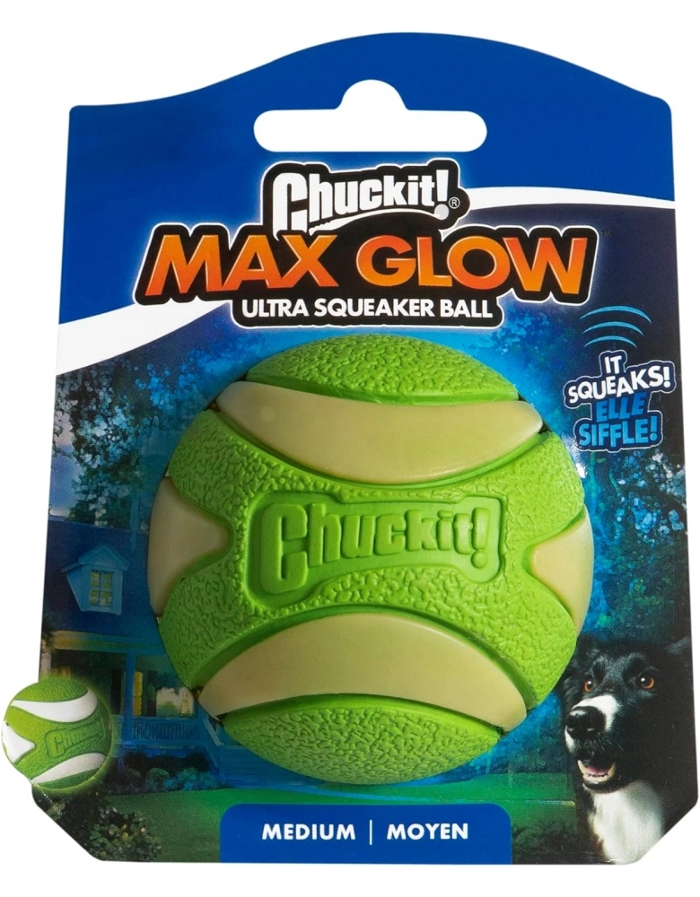 Chuckit! Max Glow – Ultra Squeaker Ball é uma combinação da ultra durável Ultra Ball com a Max Glow que birlha no escuro. Então você tem a durabilidade das Ultra Balls, o apito e a fosforescência para brincar à noite. Flutuam na água e possuem um quique ultra alto. São ultra duráveis se usadas da maneira correta. Possui apito com tecnologia que previne que o apito saia da bolinha e seja engolido pelo cão.