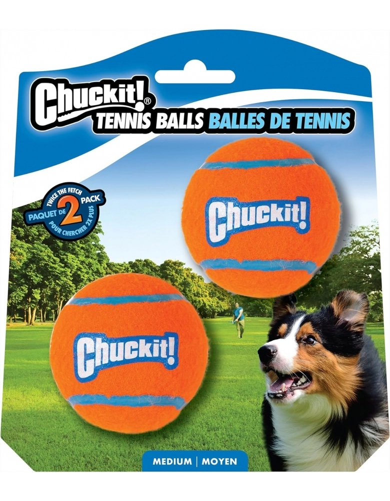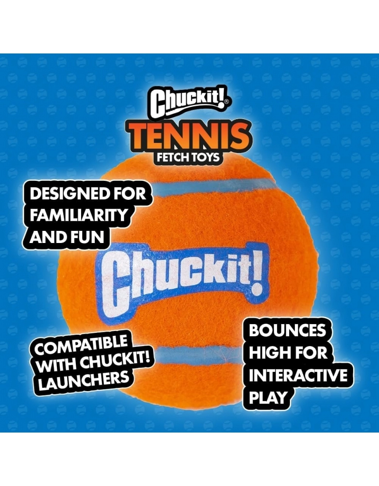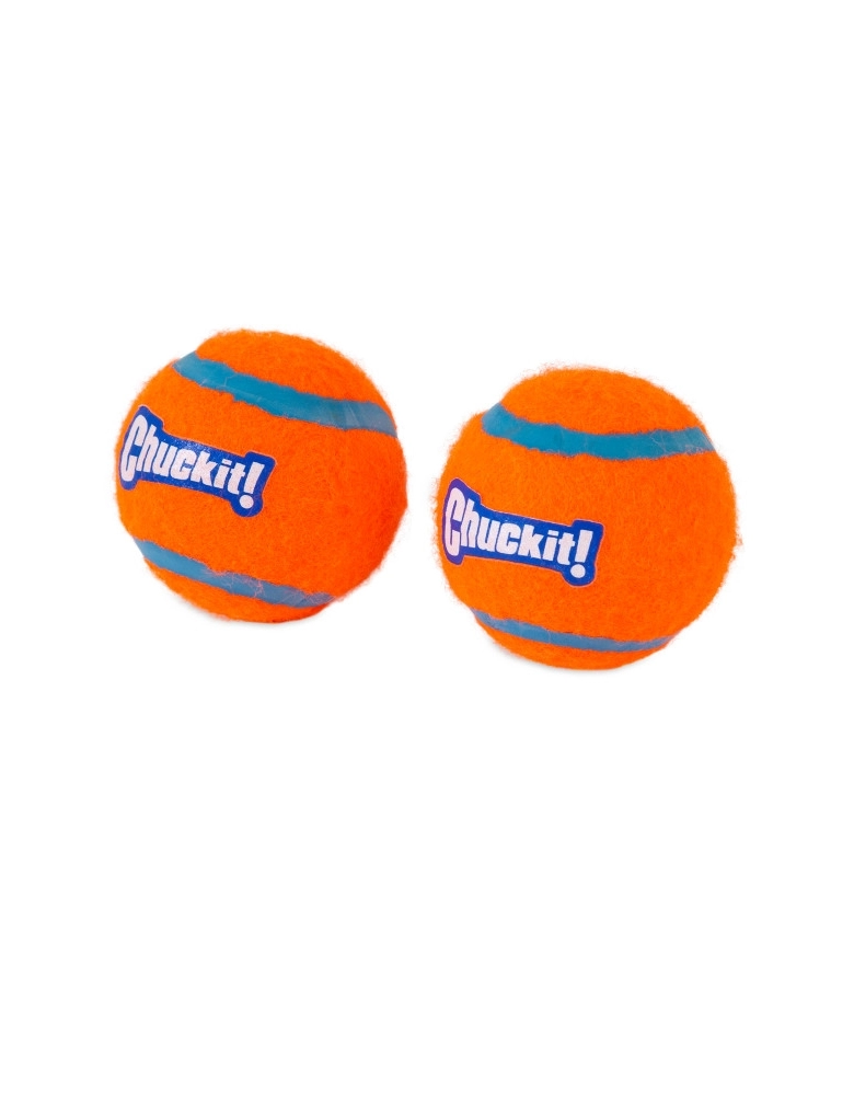Chuckit! Tennis Balls é uma bolinha fabricada com materiais de altíssima qualidade como borracha densa, que torna a bolinha flutuável na água e mais resistente que bolinhas comuns. Possuem cores chamativas para serem identificadas até no meio do mato. Não possui apito. Compatível com arremessadores Chuckit!