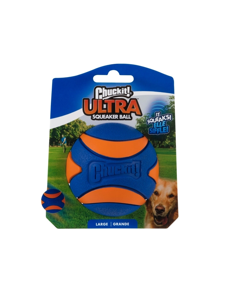 Chuckit! Ultra Squeaker Ball é uma bolinha que ultrapassa o ordinário. Feitas com altíssima qualidade. Flutuam na água e possuem um quique ultra alto. São feitas de borracha e são ultra duráveis se usadas da maneira correta. Possui apito com tecnologia que previne que o apito saia da bolinha e seja engolido pelo cão.