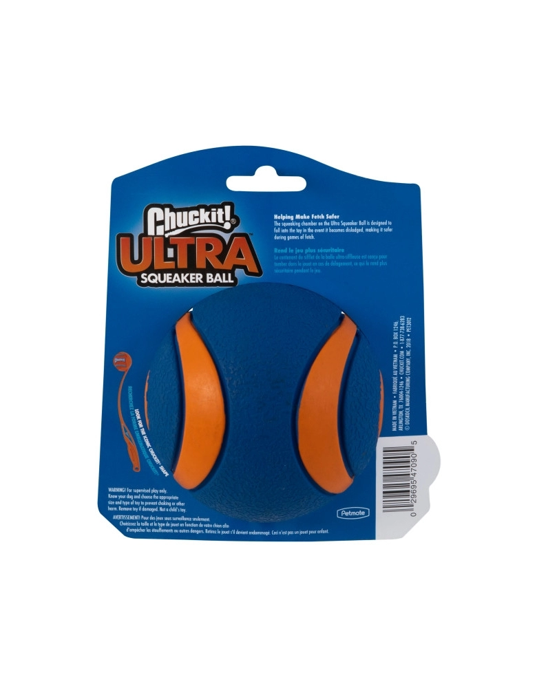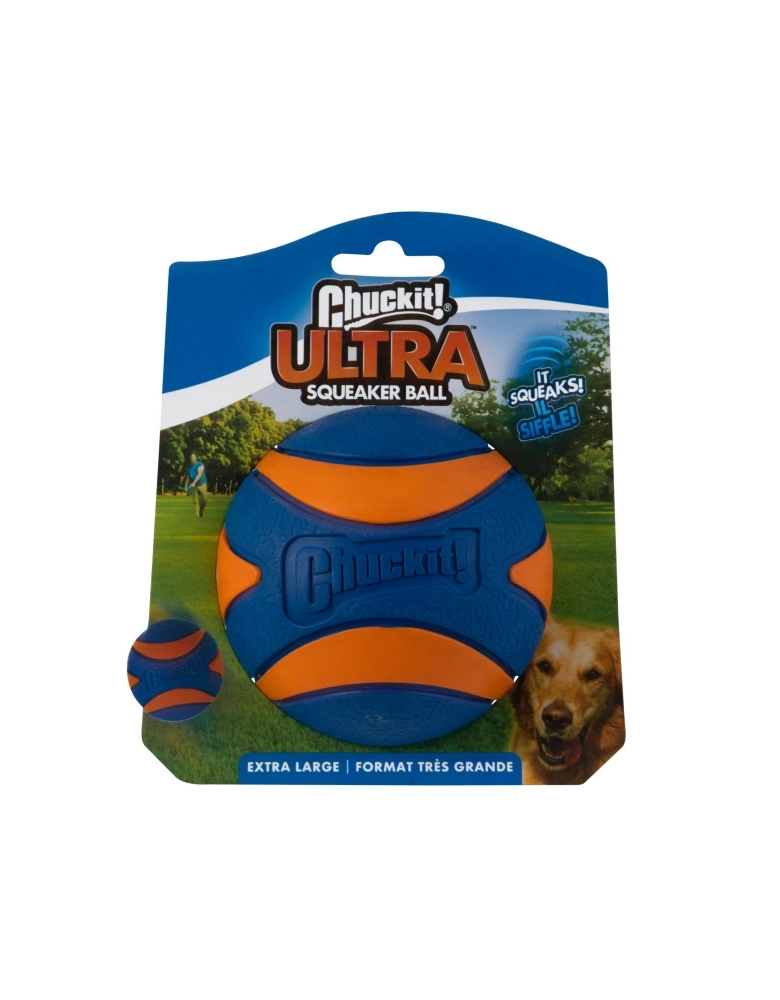 Chuckit! Ultra Squeaker Ball é uma bolinha que ultrapassa o ordinário. Feitas com altíssima qualidade. Flutuam na água e possuem um quique ultra alto. São feitas de borracha e são ultra duráveis se usadas da maneira correta. Possui apito com tecnologia que previne que o apito saia da bolinha e seja engolido pelo cão.