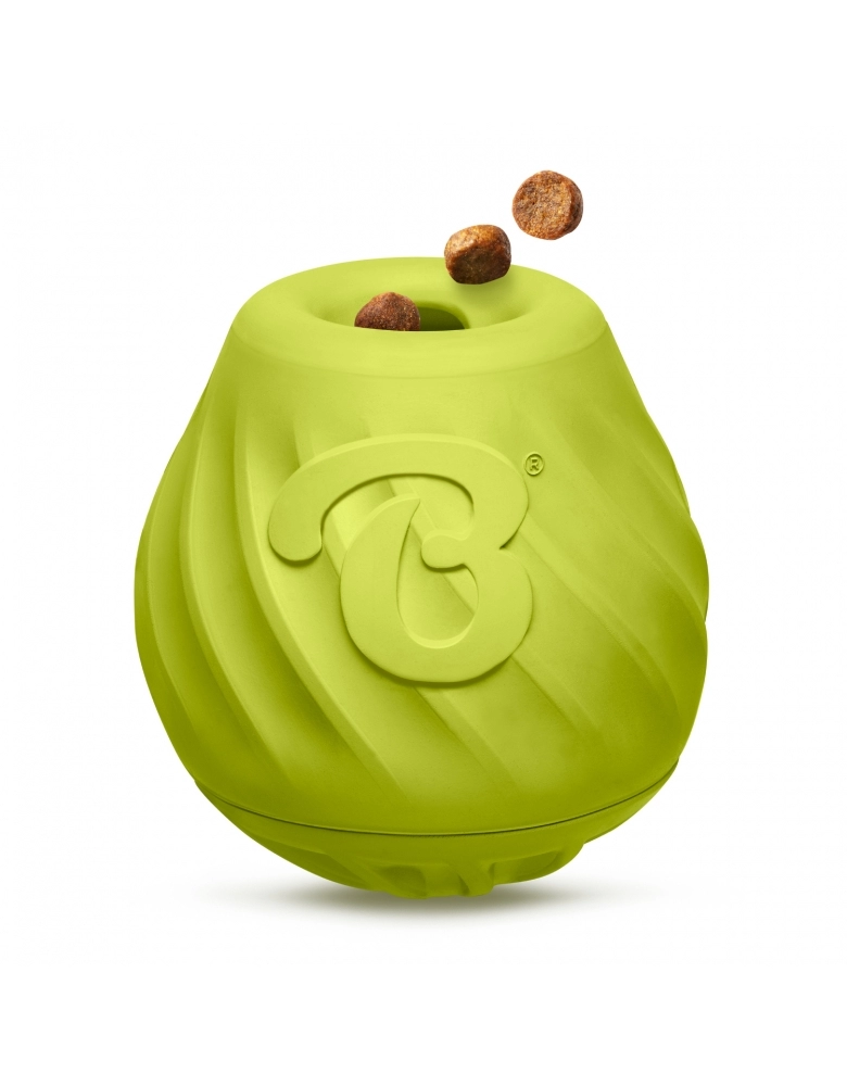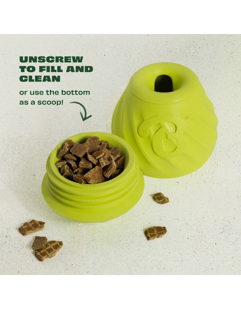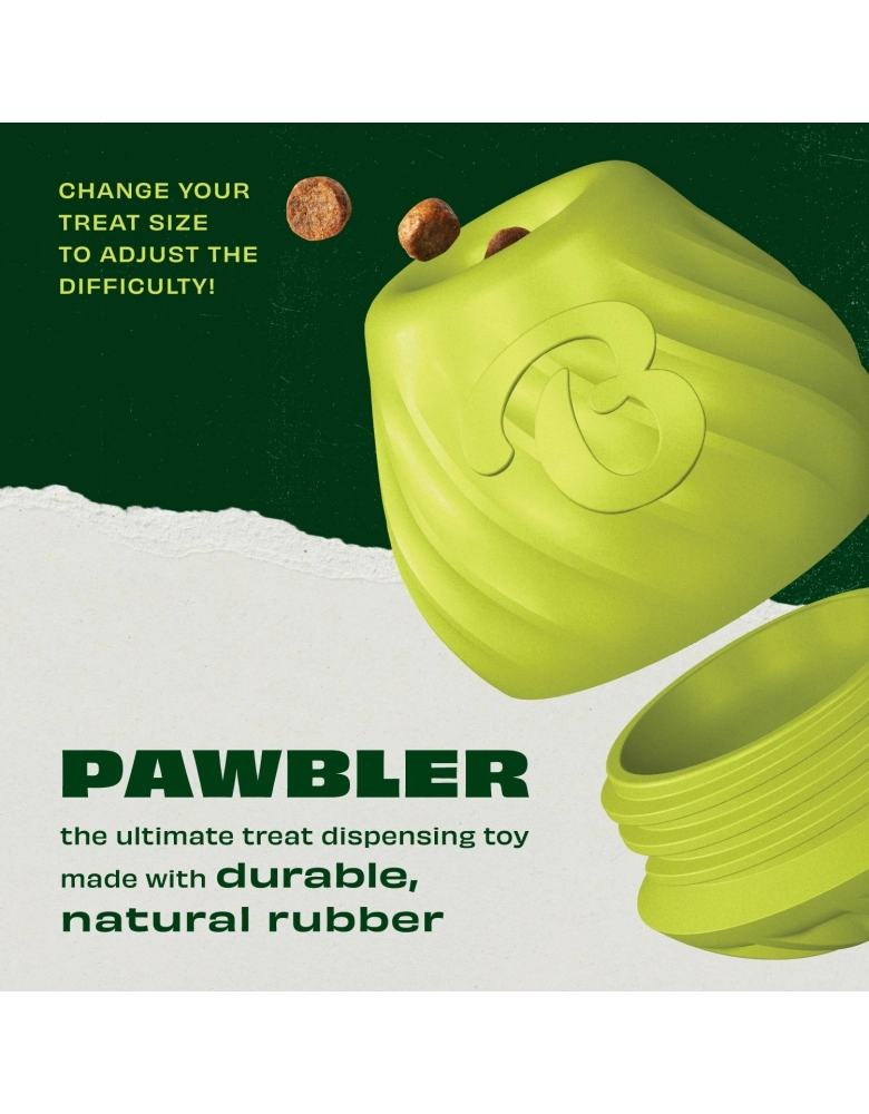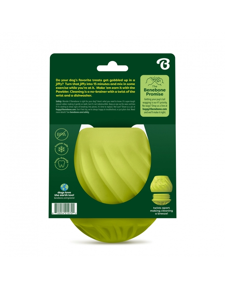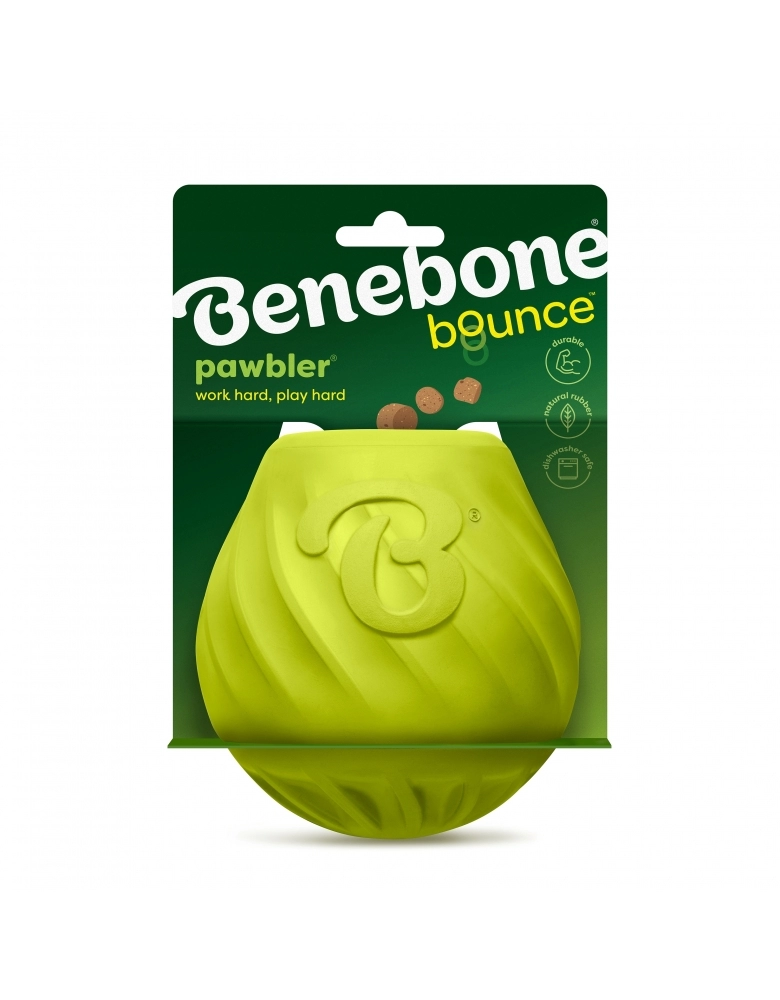 Benebone Bounce Pawbler é feito de borracha natural Indicado para todos os cães. Feitos para serem recheados com ração, alimento natural ou petiscos e fazer o cão trabalhar duro para conseguir comer. Em vez de usar o comedouro tradicional, use o Pawbler. O cão irá morder, deslizar de um lugar para o outro para conseguir pegar o alimento. Você também pode rechear com alimento natural e congelar. Também pode ser usado para brincar de jogar e trazer. Não contém BPA ou toxinas de plástico, é seguro para limpeza em máquinas de lavar louça. Desenrosque a parte de baixo para facilitar a limpeza.