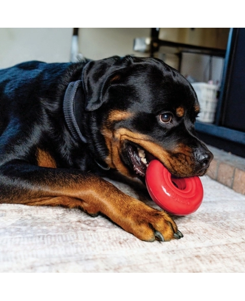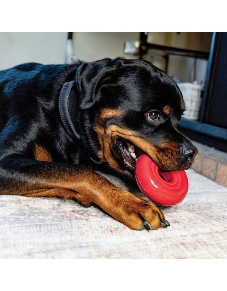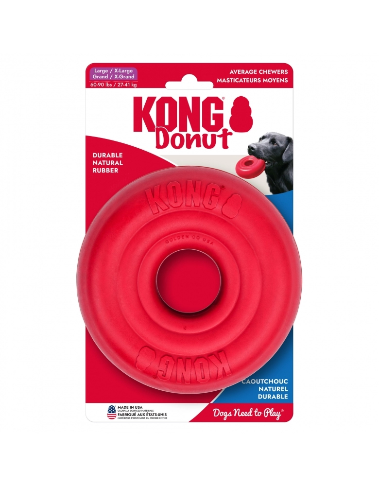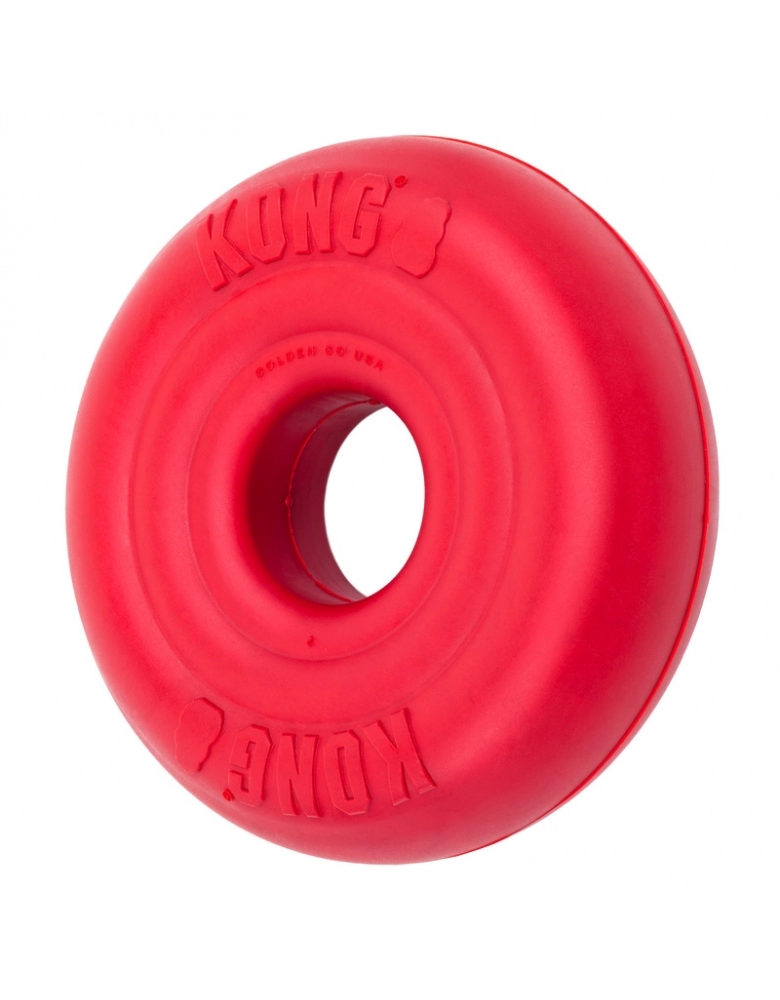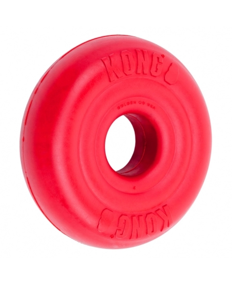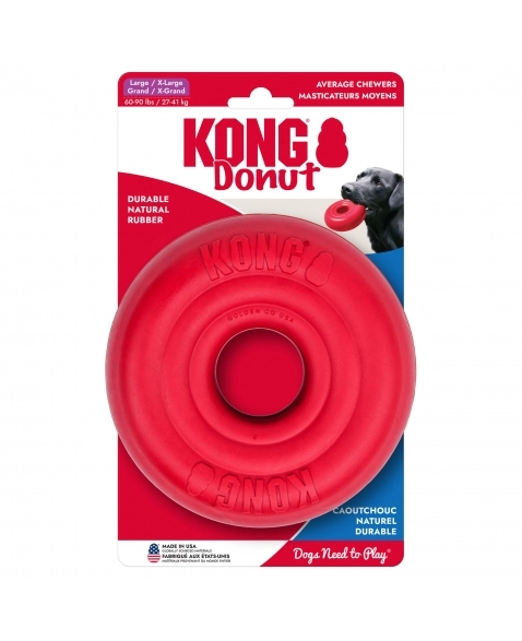 KONG Donut é um brinquedo carga pesada, ultra resistente, feito para aguentar mordidas de cães com mordidas de força moderada por longos períodos. Morder alivia o estresse, é uma atividade enriquecedora e ajuda na saúde oral do cão. Excelente brinquedo para brincar de jogar e trazer.