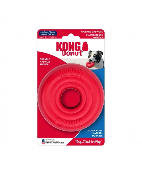 KONG Donut é um brinquedo carga pesada, ultra resistente, feito para aguentar mordidas de cães com mordidas de força moderada por longos períodos. Morder alivia o estresse, é uma atividade enriquecedora e ajuda na saúde oral do cão. Excelente brinquedo para brincar de jogar e trazer.
