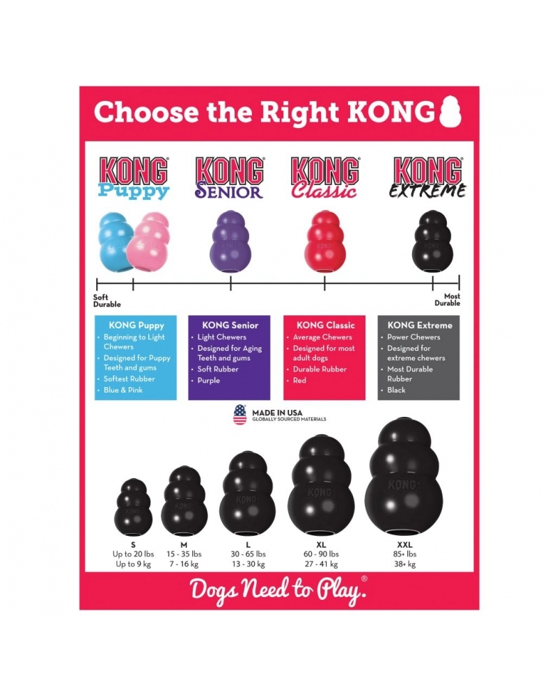 A diferença deste KONG para os demais está na densidade da borracha. Destinado a cães adultos com comportamento não excessivamente destrutivo. Para cães destrutivos e mordidas muito fortes, independentemente da raça ou tamanho, use o KONG Extreme (preto). Se for filhote, até 9 meses, use o KONG Puppy e se for idoso, Senior.