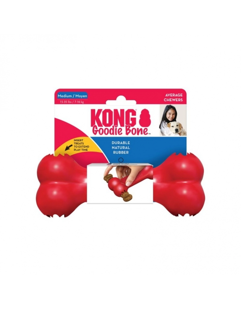 Destinado a cães de mordidas fortes, Goodie Bone é feito para ser recheado com petiscos para entreter os cães e para sessões divertidas de mordidas. Pode ser usado, também como brinquedo para brincadeiras de jogar e trazer. Possui a mesma borracha utilizada na fabricação dos KONG Classic. Destinado a cães de qualquer mordida, incluindo as fortes. Mas para cães com mordidas muito destrutivas, escolha as borrachas pretas do KONG Extreme.