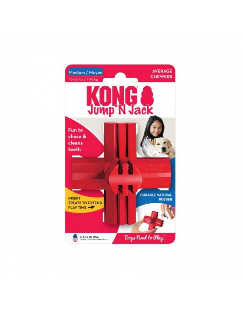 O KONG Jump`N Jack tem um salto divertido e um design exclusivo que é ótimo para sessões de mastigação e jogos de busca. Os patenteados Denta-Ridges (TM) reduzem a placa, ao mesmo tempo que proporcionam uma limpeza abrasiva suave e condicionamento dos dentes e gengivas.