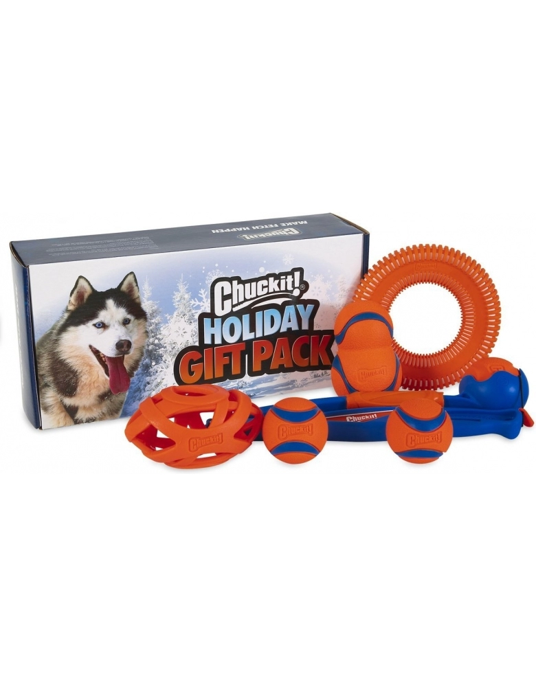 Chuckit! Holiday Pack é uma caixa que contém um lançador de bolinhas dobrável Fetch & Fold, uma bola Chuckit Fetch Ball, uma Bola de Futebol Americano de borracha – Chuckit! Air Football, que permite que o cão respire pela boca enquanto traz o brinquedo de volta para você, um Chuckit! Ultra Tumbler, que quica de formas irregulares, aumentando o estímulo, um Rugged Flyer e duas bolinhas Chuckit! Ultra Ball médias.