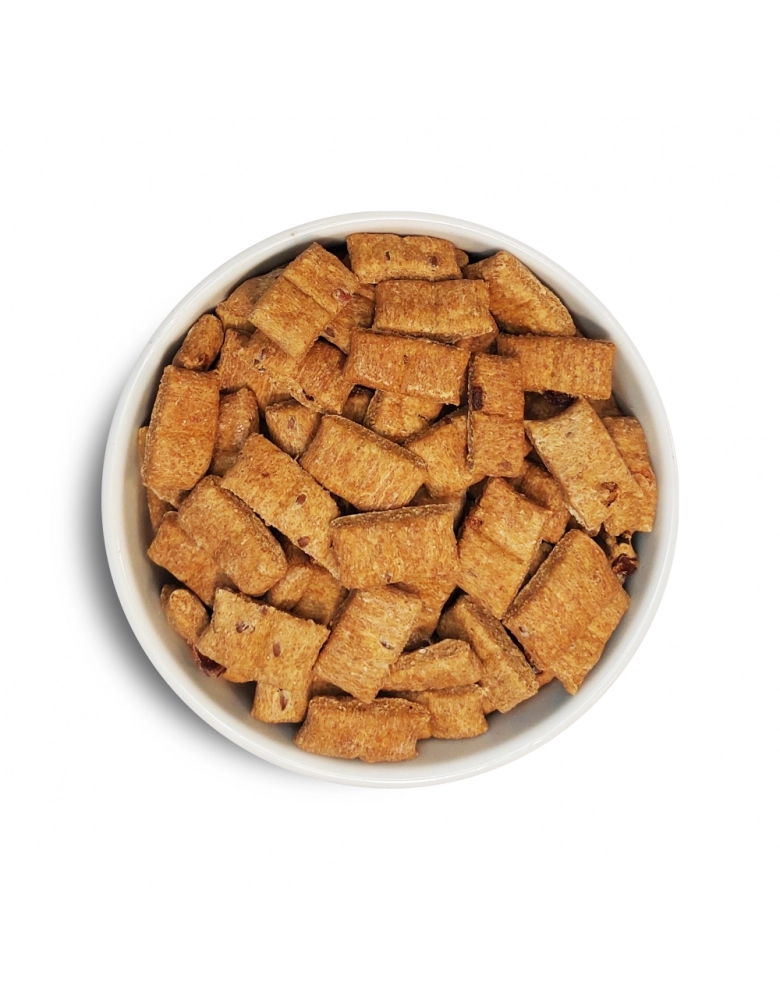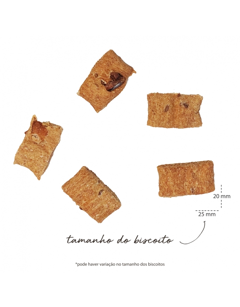 Farinha de trigo integral orgânica, polpa de goiaba orgânica, óleo de soja orgânico, açúcar mascavo orgânico, grão de linhaça orgânica, maçã desidratada*, farelo de goiaba*, semente de pysillium*, levedura inativada desidratada*, extrato de levedura*, biomassa de microalgas Schizochytrium sp*, concentrado de tocoferóis*, extratos vegetais (alecrim, hortelã e chá verde)* (*ingredientes não orgânicos).
