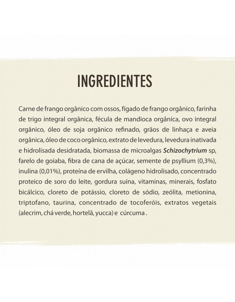 Carne de frango orgânico com ossos, fígado de frango orgânico, ovo orgânico, arroz integral orgânico, cenoura orgânica, abóbora orgânica, brócolis orgânico, espinafre orgânico, óleo de soja orgânico, semente de chia orgânica, grãos de linhaça e quinoa orgânicos, aveia orgânica, água*, levedura inativada desidratada*, proteína concentrada do soro do leite*, biomassa de microalgas Schizochytrium sp*, vitaminas (A, D, E, K3, B1, B2, B6, B12, C, niacina, ácido fólico, biotina)*, fosfatidilcolina*, minerais (sulfato de ferro, sulfato de cobre, sulfato de manganês, organomanganês, sulfato de zinco, organozinco, iodato de cálcio, selenito de sódio, organoselênio)*, cloreto de potássio*, cloreto de sódio*, metionina*, taurina*, tocoferol*, extratos vegetais (alecrim, hortelã, chá verde, yucca, alcachofra)*,cúrcuma*. (*ingredientes não orgânicos).