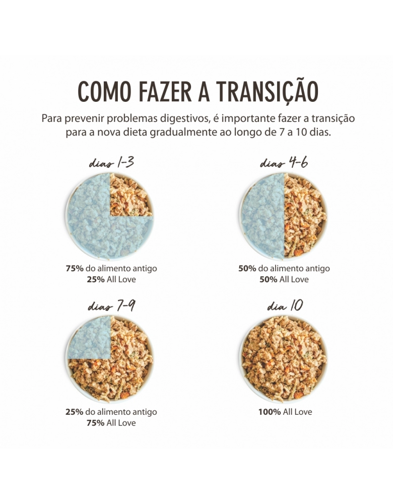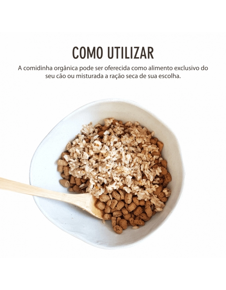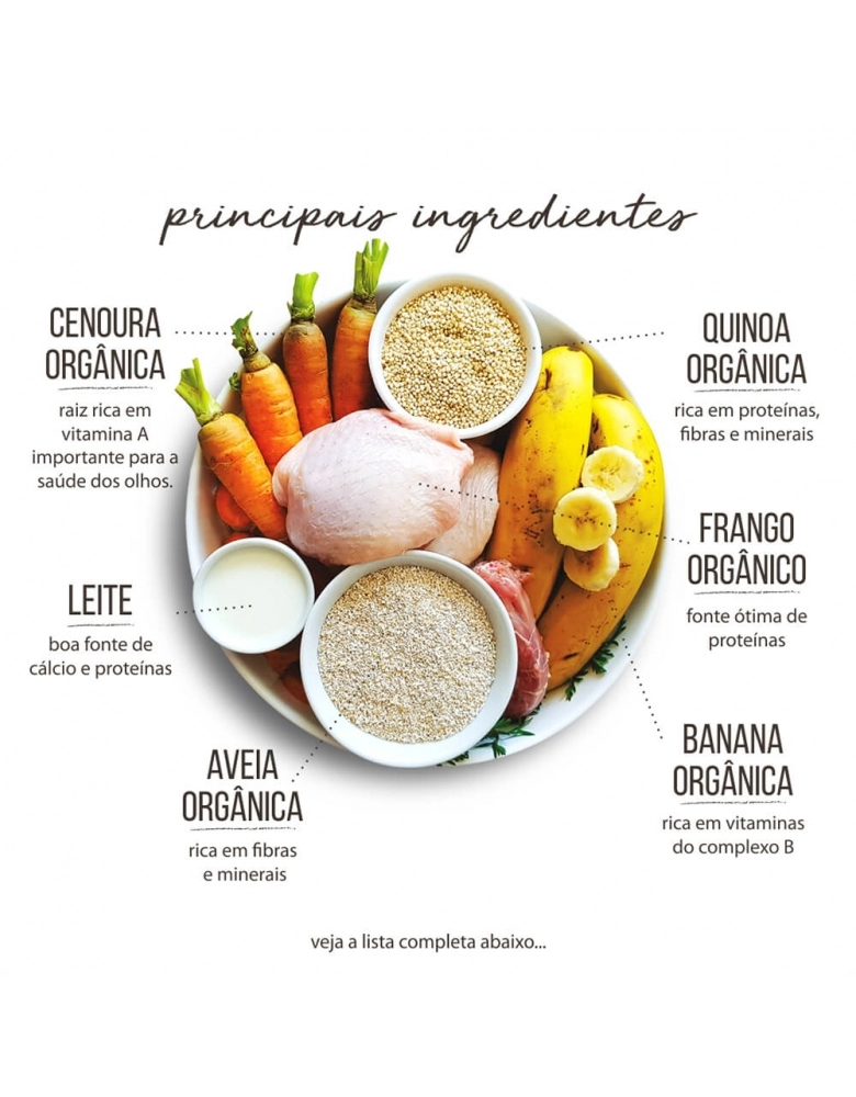 Carne de frango orgânico com ossos, fígado de frango orgânico, arroz integral orgânico, cenoura orgânica, brócolis orgânico, espinafre orgânico, óleo de soja orgânico, ovo orgânico, sementes de chia orgânica, grãos de linhaça e quinoa orgânicas, aveia orgânica, banana desidratada orgânica, água*, levedura inativada desidratada*, proteína concentrada do soro do leite*, biomassa de microalgas Schizochytrium sp*, aipo em desidratado*, vitaminas (A, D, E, K3, C, B1, B2, B6, B12, C, niacina, ácido fólico, biotina)*, fosfatilcolina*, minerais (sulfato de ferro, sulfato de cobre, sulfato de manganês, organomanganês, sulfato de zinco, organozinco, iodato de cálcio, selenito de sódio, organoselênio)*, cloreto de potássio*, cloreto de sódio*, metionina*, tocoferol*, extratos vegetais (alecrim, hortelã, chá verde, yucca)*, extrato de própolis*, cúrcuma*.