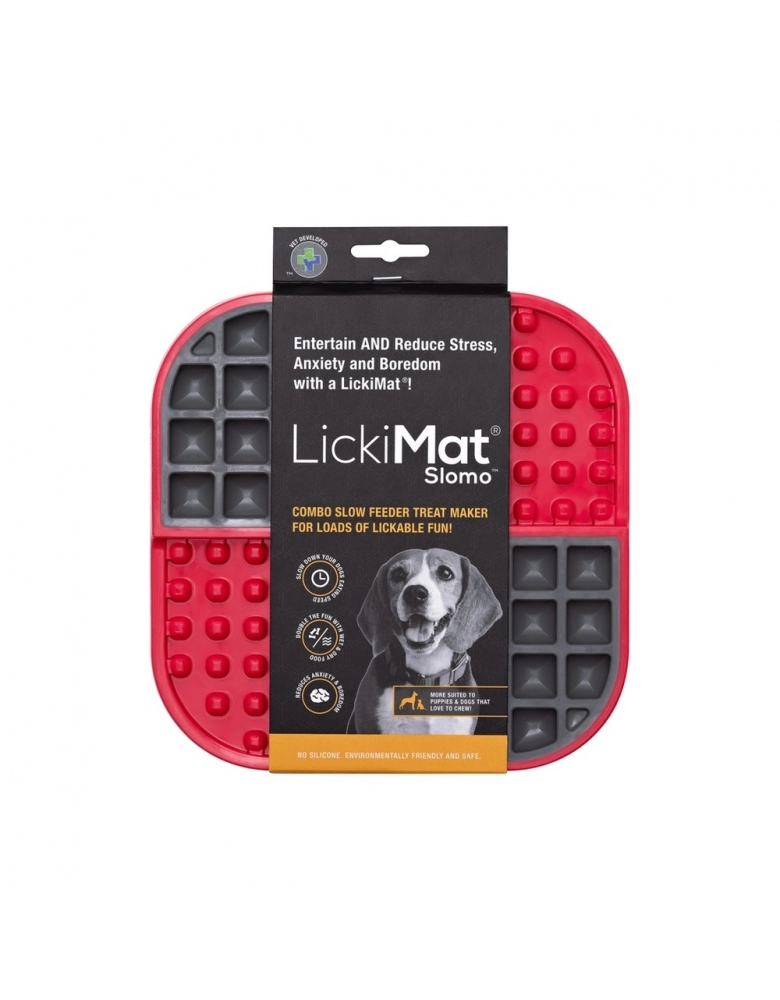 LickiMat Slomo é um alimentador desenvolvido por veterinários que tem o objetivo de divertir, reduzir o estresse, ansiedade e tédio de seu cão. Reduz a velocidade de ingestão de alguns segundos para alguns minutos. Você pode usar uma mescla de alimentos secos e úmidos. Feito com plástico rígido e borracha possui um design indicado para c ães que adoram morder. Não contém silicone, BPA, PVC, ftalatos ou qualquer outro material tóxico. Possui duas superfícies distintas divididas em duas seções que permite que tipos diferentes de comida sejam servidos ao mesmo tempo. Indicado para filhotes, cães pequenos, médios ou grandes e até mesmo, extra grandes. E gatos também.