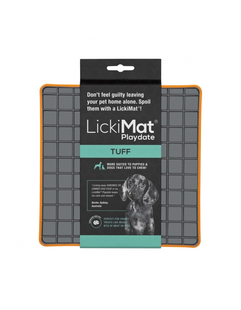 LickiMat Tuff Series Playdate é um alimentador desenvolvido por veterinários que tem o objetivo de divertir, reduzir o estresse, ansiedade e tédio de seu cão. Reduz a velocidade de ingestão de alguns segundos para alguns minutos. Feito com uma bandeja de plástico rígido e borracha, possui um design indicado para cães que adoram morder. Não contém silicone, BPA, PVC, ftalatos ou qualquer outro material tóxico. Indicado para filhotes, cães pequenos, médios ou grandes e até mesmo, extra grandes. E gatos também. Benefícios: Reduz ansiedade e tédio, estimula salivação e melhora a saúde digestiva. Promove hálito mais fresco e gengivas e dentes mais saudáveis. Redireciona todos os hábitos de lambida. Bons e maus. Diminui a velocidade de ingestão, reduz risco de inchaços. Uma alternativa segura para seu cão lamber. Ótimo para refeições inteiras ou lanche intermediário. Reduz o tempo de treino para caixa de transporte.