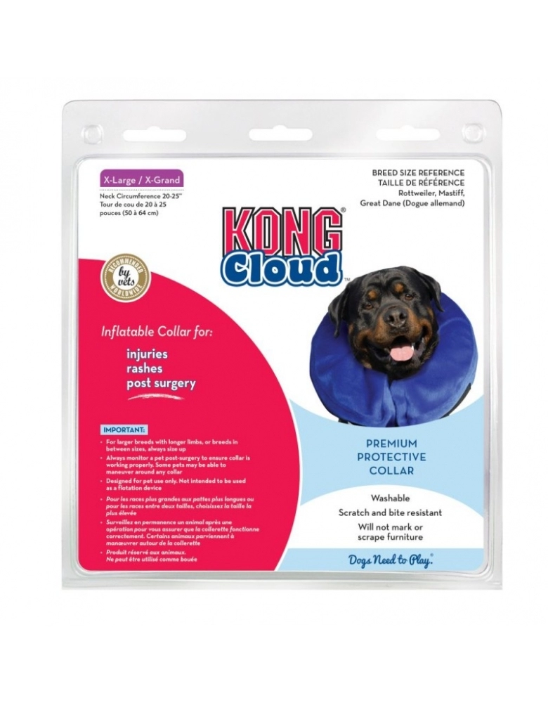 The KONG Cloud™ Collar é um substituto dos tradicionais e desconfortáveis colares elizabetanos do mercado. É macio, confortável e não interfere na habilidade do cão de comer e beber água. Este colar macio é lavável à máquina e é uma maneira mais confortável e menos traumática de ajudar seu cão a se recuperar de uma cirurgia ou ferimento.