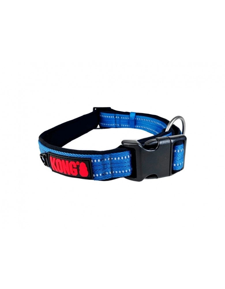 KONG Nylon Colar é feito com material almofadado e refletivo para segurança em passeios noturnos. Fabricado com nylon reforçado e Neoprene para resistência, durabilidade e conforto. Modo de usar: Passe pelo pescoço do cão, ajuste e use o fecho único para abrir e
