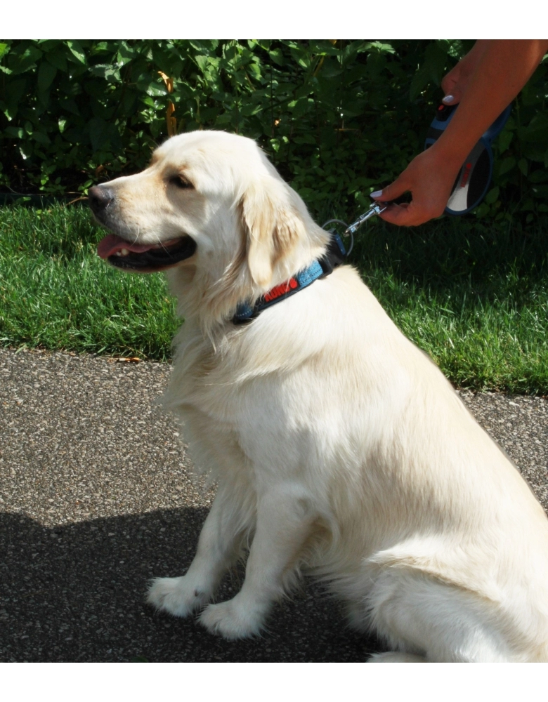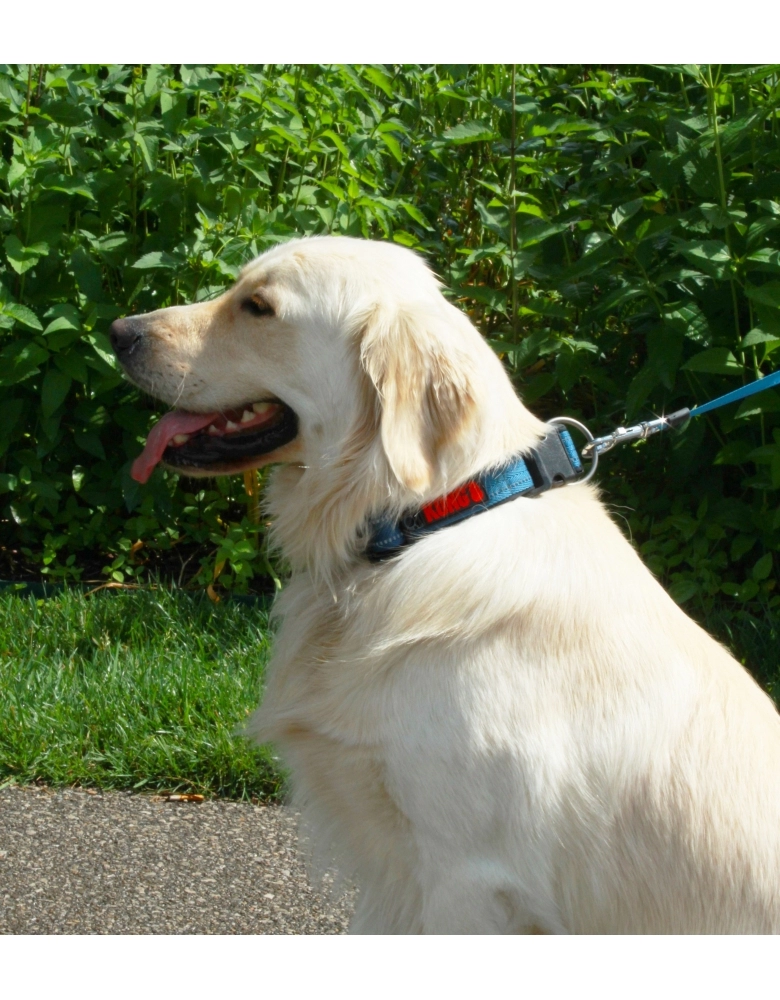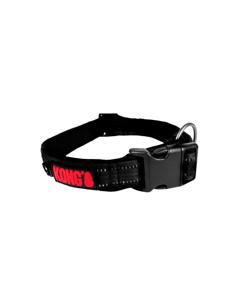 KONG Nylon Colar é feito com material almofadado e refletivo para segurança em passeios noturnos. Fabricado com nylon reforçado e Neoprene para resistência, durabilidade e conforto. Modo de usar: Passe pelo pescoço do cão, ajuste e use o fecho único para abrir e
