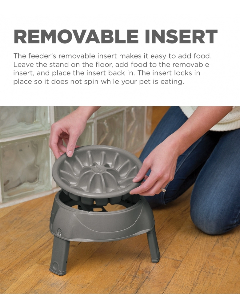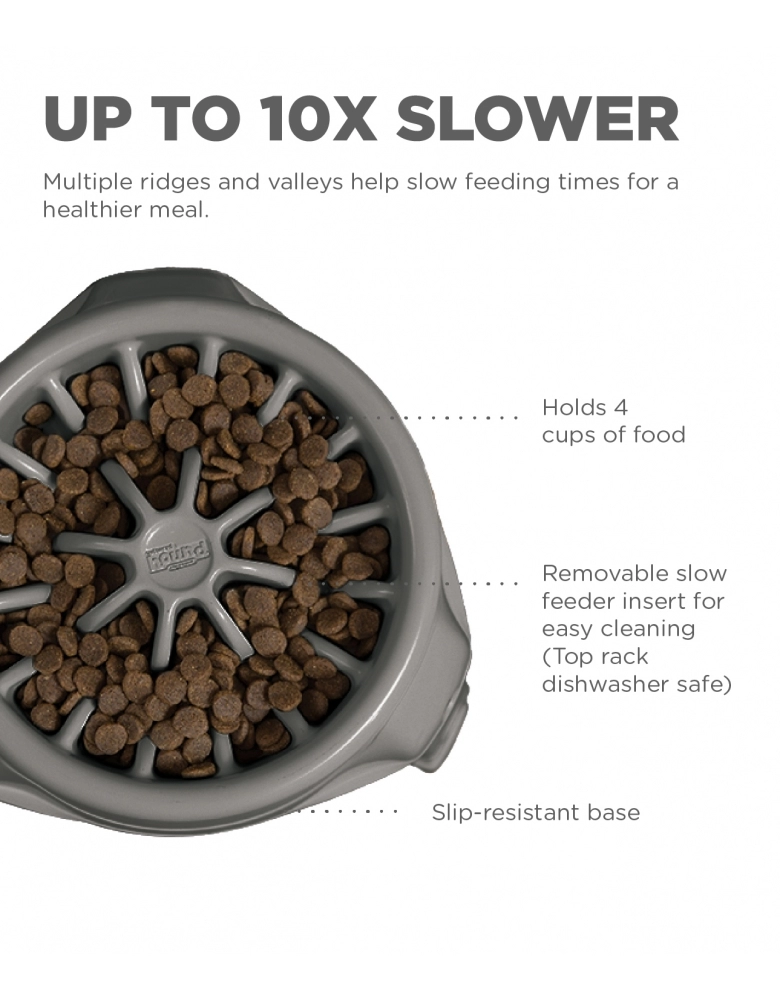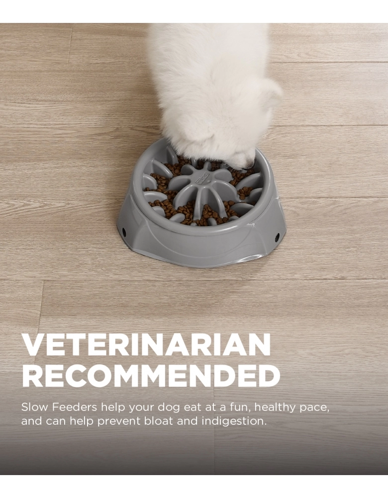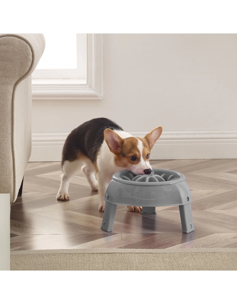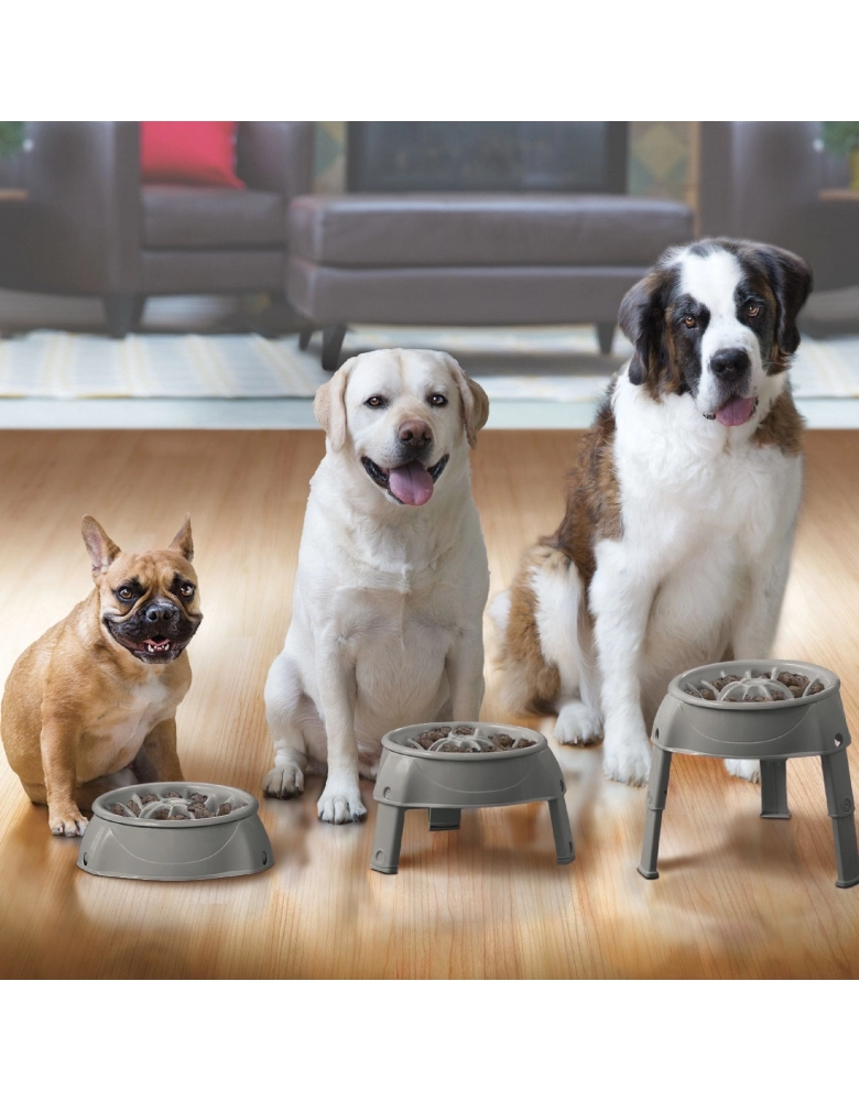 Comedouro lento, saudável com ajuste de altura. Faz com que seu cão coma até 10 vezes mais lentamente. Recomendado por veterinários pois faz com que o cão coma mais lentamente evitando problemas digestivos e melhorando de forma geral, a digestão dos alimentos. Possui uma base antiderrapante. Fabricado com materiais destinados à alimentação. Capacidade de até 4 xícaras (alimento seco ou úmido).
