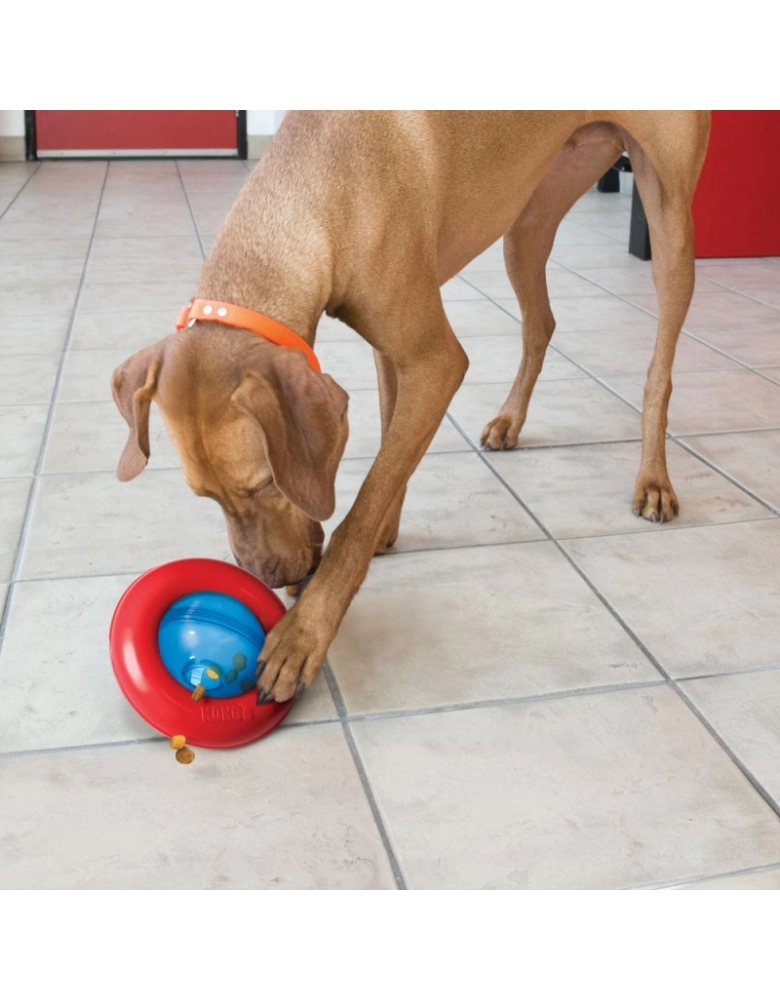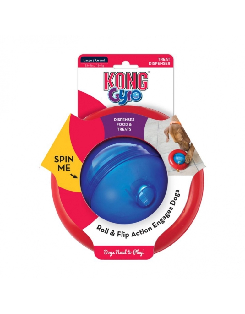 KONG GYRO® é um brinquedo feito com os materiais mais seguros e resistentes do mercado. Rolando e virando de forma irresistível, mantém os cães interessados e intrigados. A esfera central gira quando tocada pelo cão, liberando petiscos ou ração. O anel exterior é estático. Os cães satisfazem seus instintos de trabalhar para comer, se divertem e se alimentam mais lentamente, o que melhora significativamente a digestão e evita problemas de saúde. Desenvolvido para cães de mordida moderada ou leve. Para cães com mordida destrutiva, opte por brinquedos KONG de borracha. Nunca deixe o cão sozinho com o brinquedo, nem por alguns minutos. Acabado o alimento ou petiscos, higienize e guarde para a próxima.