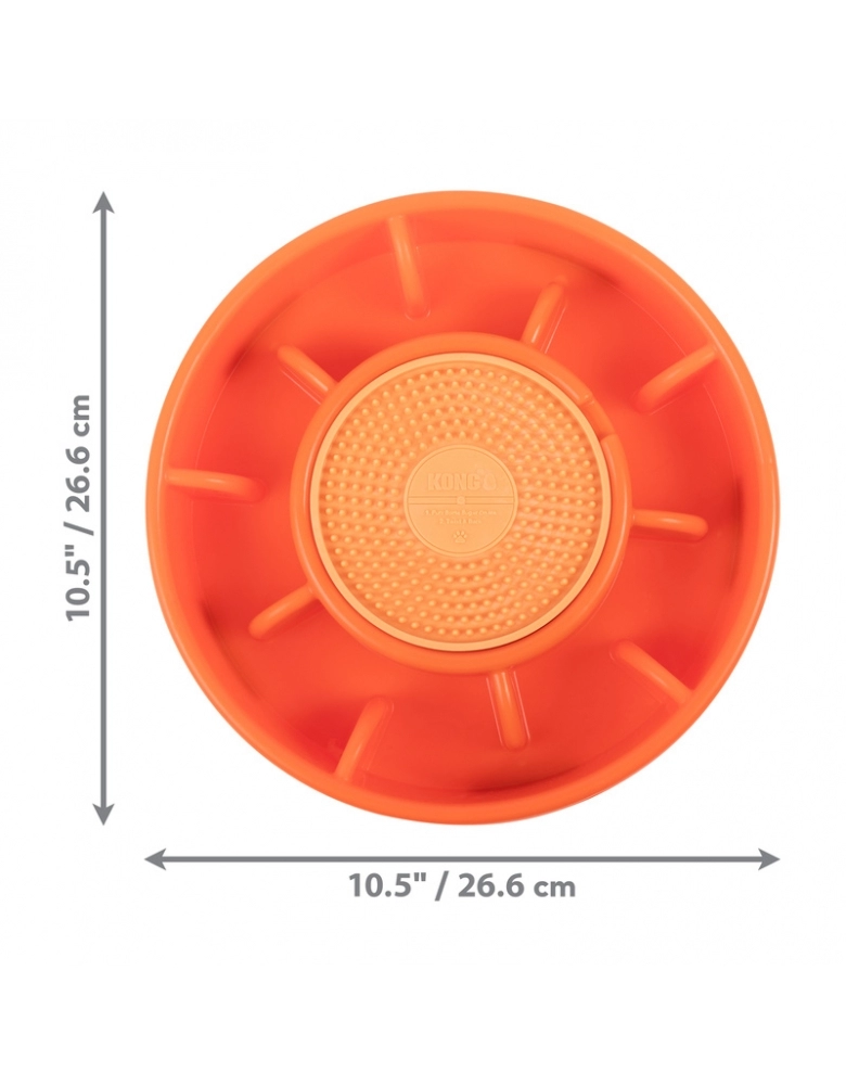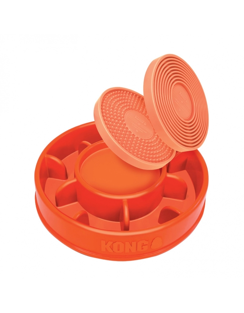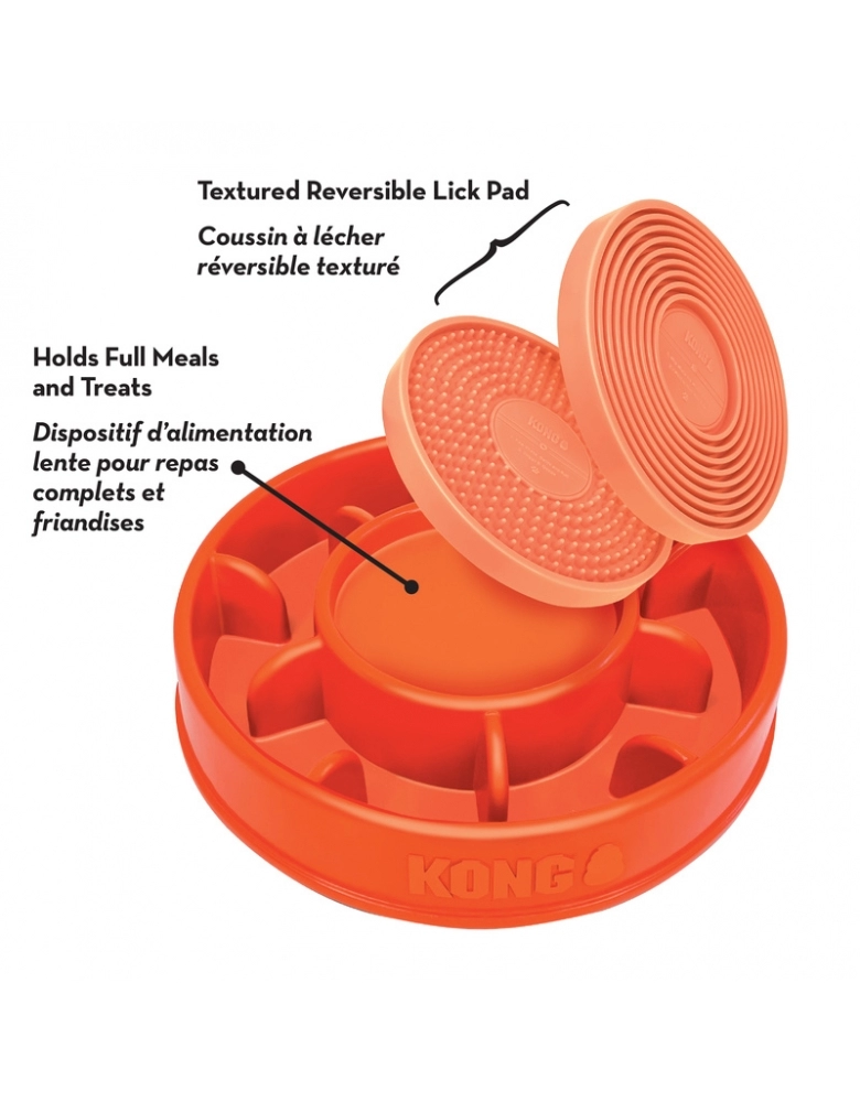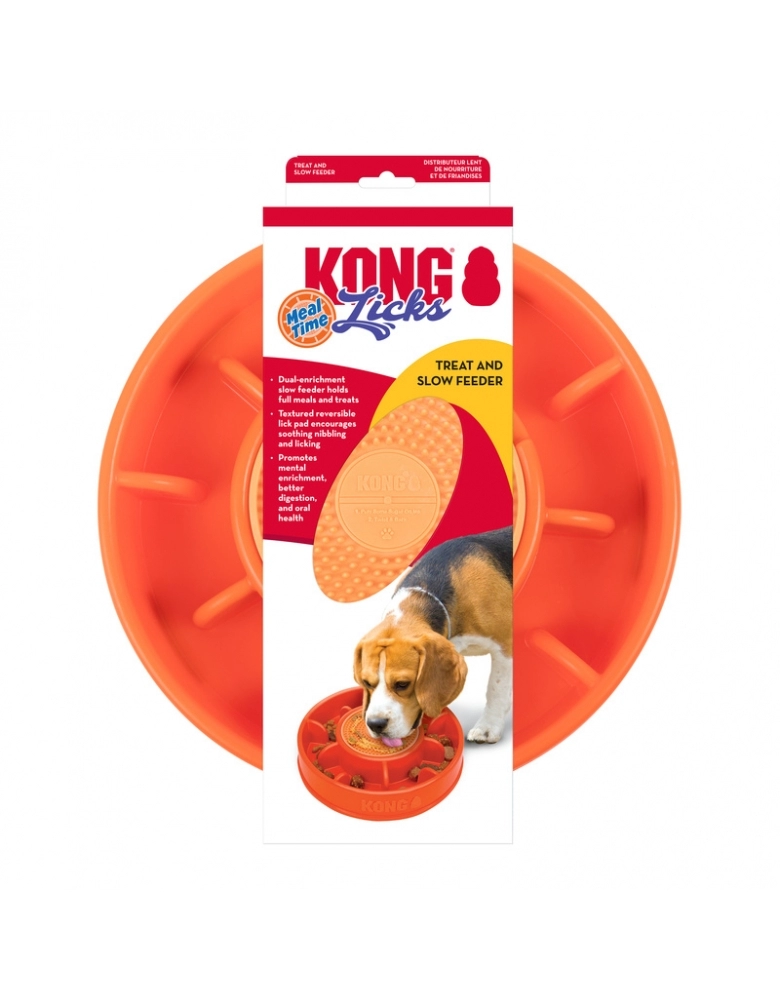 O KONG Licks Mealtime é um alimentador interativo de duplo enriquecimento para cães que precisam de um desafio. Este brinquedo pode ser utilizado para abrandar os cães que comem depressa, para uma melhor digestão, perda de peso, enriquecimento mental e para apoiar uma boa saúde oral. A almofada de lamber reversível tem saliências e sulcos para segurar alimentos pastosos, incentivando a mordidela e a lambidela lentas para promover momentos calmos e tranquilos. O Licks Mealtime é ideal para dias de chuva, entretenimento a solo, estimulação mental e alimentação ou tratamento diário. Comporta até 4 xícaras de comida seca. A almofada para lamber é amovível para facilitar a limpeza. A tigela e a almofada para lamber devem ser lavadas à mão e secas com uma toalha.