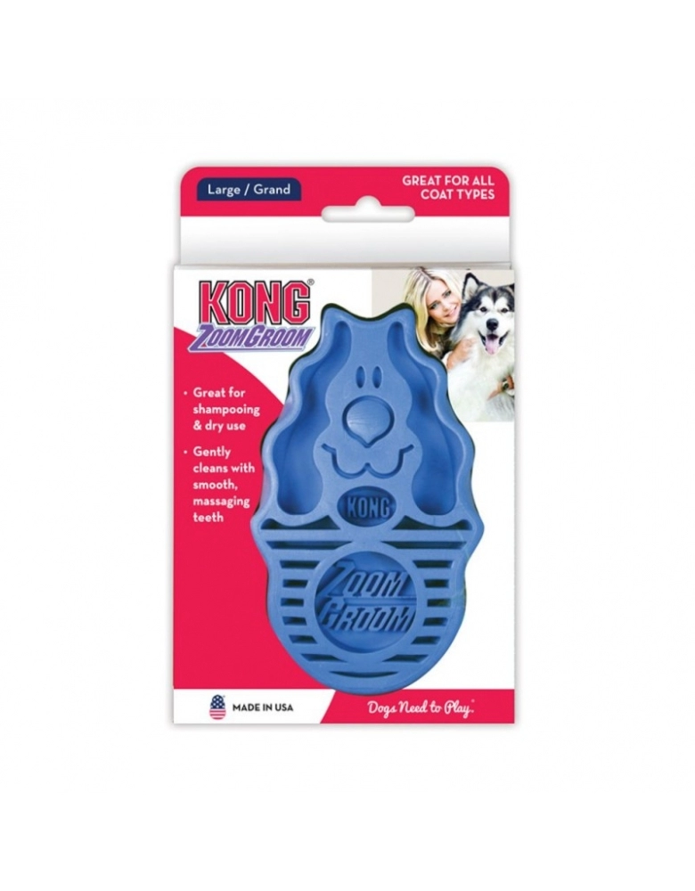 KONG ZoomGroom é uma verdadeira máquina de tirar pelos mortos dos cães quando usada a seco e uma verdadeira máquina massageadora e limpadora quando usada no banho. Uma escova desenvolvida há muitos anos, mas que continua moderna e atual, sendo altamente recomendada pelos tutores mais cuidadosos e apaixonados pelos seus cães. Feita 100% de borracha é leve e não machuca ou irrita a pele do animal, nem repuxa os pelos.