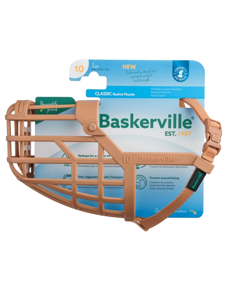A Focinheira Clássica Baskerville foi criada usando um material aprimorado de borracha termoplástica (TPR), que é mais leve do que o design clássico de plástico, mas 4 vezes mais forte e com maior durabilidade. Esse material exclusivo permite que a focinheira seja remodelada para um ajuste personalizado em água quente. A Focinheira Baskerville Classic Basket vem com uma inserção de proteção adicional para evitar que o cão pegue alimentos e animais selvagens em caminhadas, coma pedras, coprofagia e lamba feridas após a cirurgia. O design da cesta garante o bem-estar do cão, permitindo que ele ofegue, beba e brinque. Com uma peça de nariz acolchoada aprimorada e uma alça de pescoço segura e fácil de ajustar, todos os cães podem se sentir confortáveis usando a focinheira, mantendo os donos felizes e confiantes em todas as situações. Possui, em sua ponta, um pequeno painel deslizante que deve ser deixado na focinheira para evitar que o cão coma algo indevido, durante um passeio ou no ambiente que fica, ataque pequenos animais ou consiga comer fezes. Caso este não seja o problema do cão, basta empurrar para trás e deslizar para cima e remover este painel. Isso permitirá que o cão coma alimentos e petiscos.