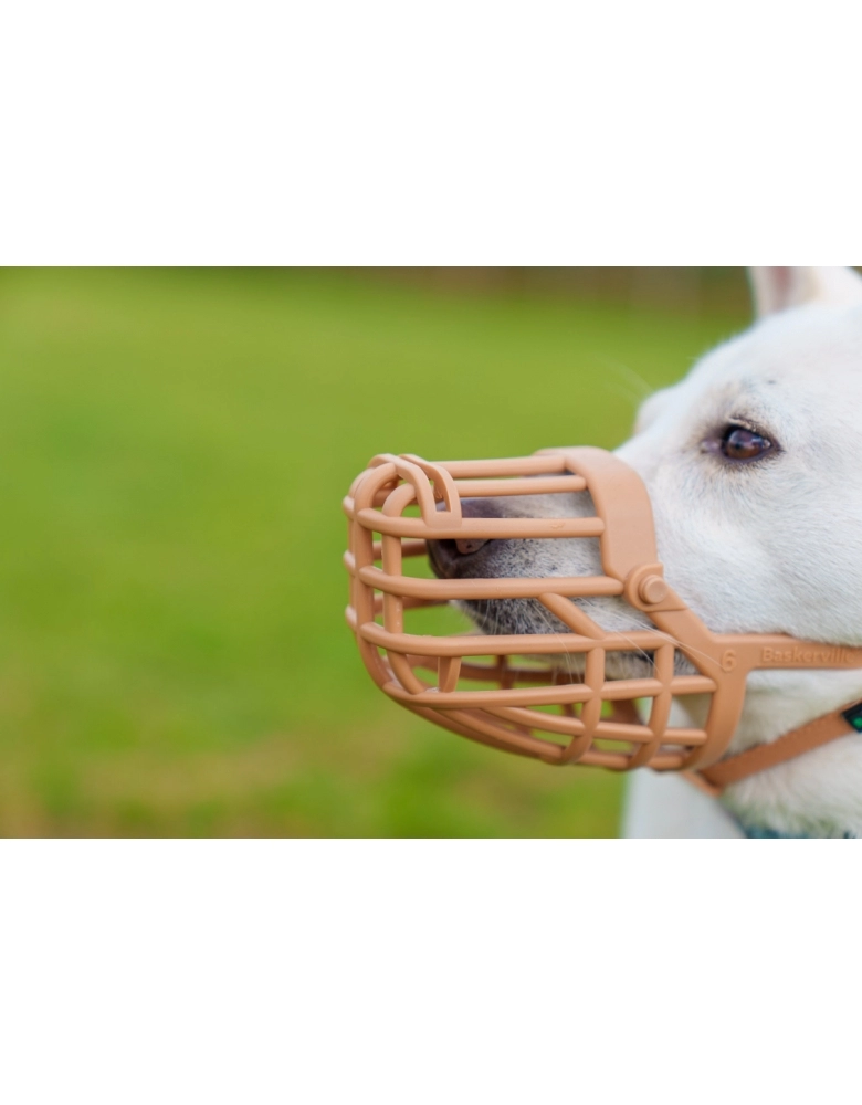 A Focinheira Clássica Baskerville foi criada usando um material aprimorado de borracha termoplástica (TPR), que é mais leve do que o design clássico de plástico, mas 4 vezes mais forte e com maior durabilidade. Esse material exclusivo permite que a focinheira seja remodelada para um ajuste personalizado em água quente. A Focinheira Baskerville Classic Basket vem com uma inserção de proteção adicional para evitar que o cão pegue alimentos e animais selvagens em caminhadas, coma pedras, coprofagia e lamba feridas após a cirurgia. O design da cesta garante o bem-estar do cão, permitindo que ele ofegue, beba e brinque. Com uma peça de nariz acolchoada aprimorada e uma alça de pescoço segura e fácil de ajustar, todos os cães podem se sentir confortáveis usando a focinheira, mantendo os donos felizes e confiantes em todas as situações. Possui, em sua ponta, um pequeno painel deslizante que deve ser deixado na focinheira para evitar que o cão coma algo indevido, durante um passeio ou no ambiente que fica, ataque pequenos animais ou consiga comer fezes. Caso este não seja o problema do cão, basta empurrar para trás e deslizar para cima e remover este painel. Isso permitirá que o cão coma alimentos e petiscos.