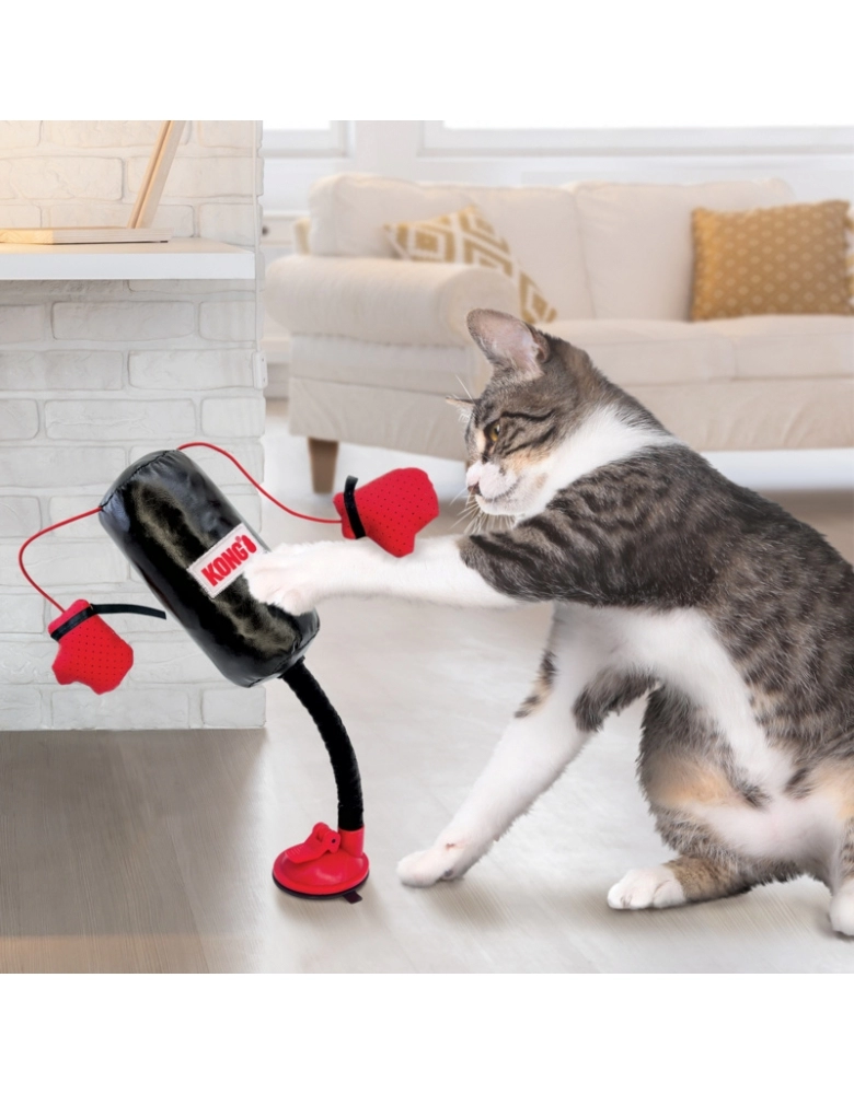KONG Connects Punching Bag é um brinquedo que você pode levar para onde quiser e que nocauteia o tédio com um saco de pancadas com estalidos e luvas incrivelmente estimulantes, com guizos. Além disso conta com recheio de Catnip especial da KONG. A ventosa serve para ser colocada em locais verticais lisos. 1 – Escolha um local limpo e liso para prender a ventosa, que também deve estar limpa. 2 – Empurre a ventosa na superfície lisa 3 - baixe a trava até ouvir o clique. Molhe sempre a ventosa com água antes de grudá-la. Para limpar a ventosa, lave com água e deixe secar sozinha.